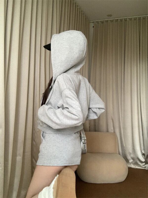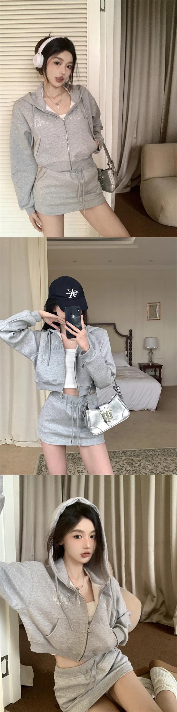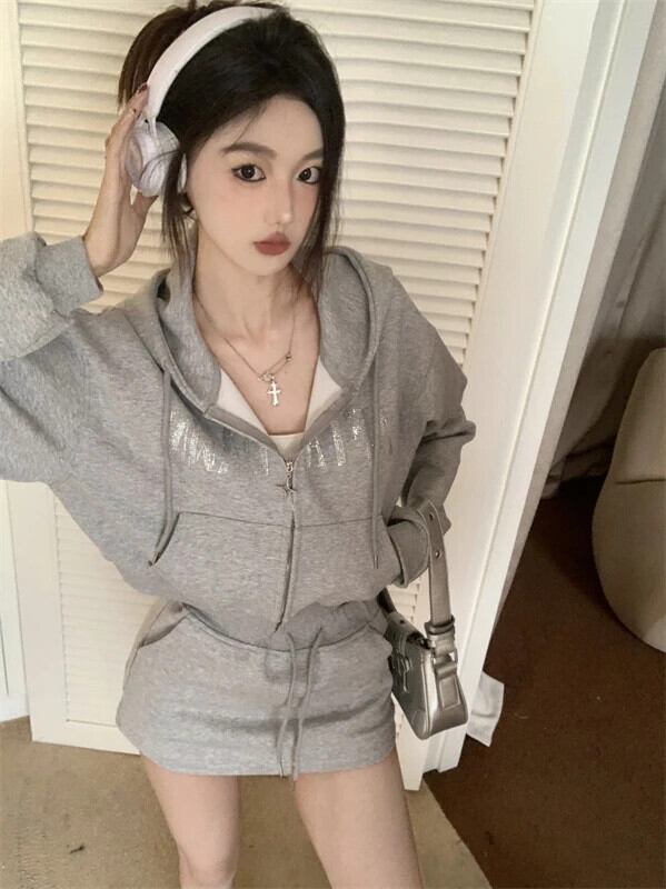 アメリカンレトロスーツ秋/冬グレーフード付きラインストーンショートコートウエストミニスカートツーピースセット オータム 秋物 ウィンター 冬物