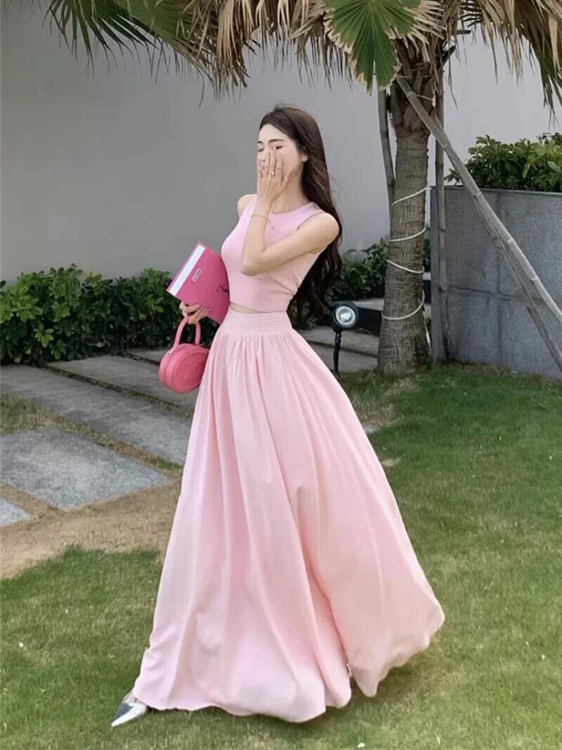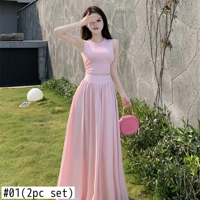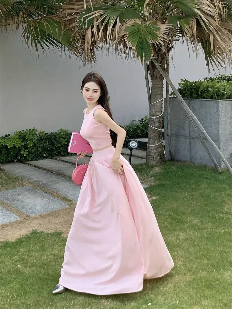 純粋セクシーホットガールスーツ夏ノースリーブショートニットタンクトップウエストロングスカートツーピースセット サマー 夏物