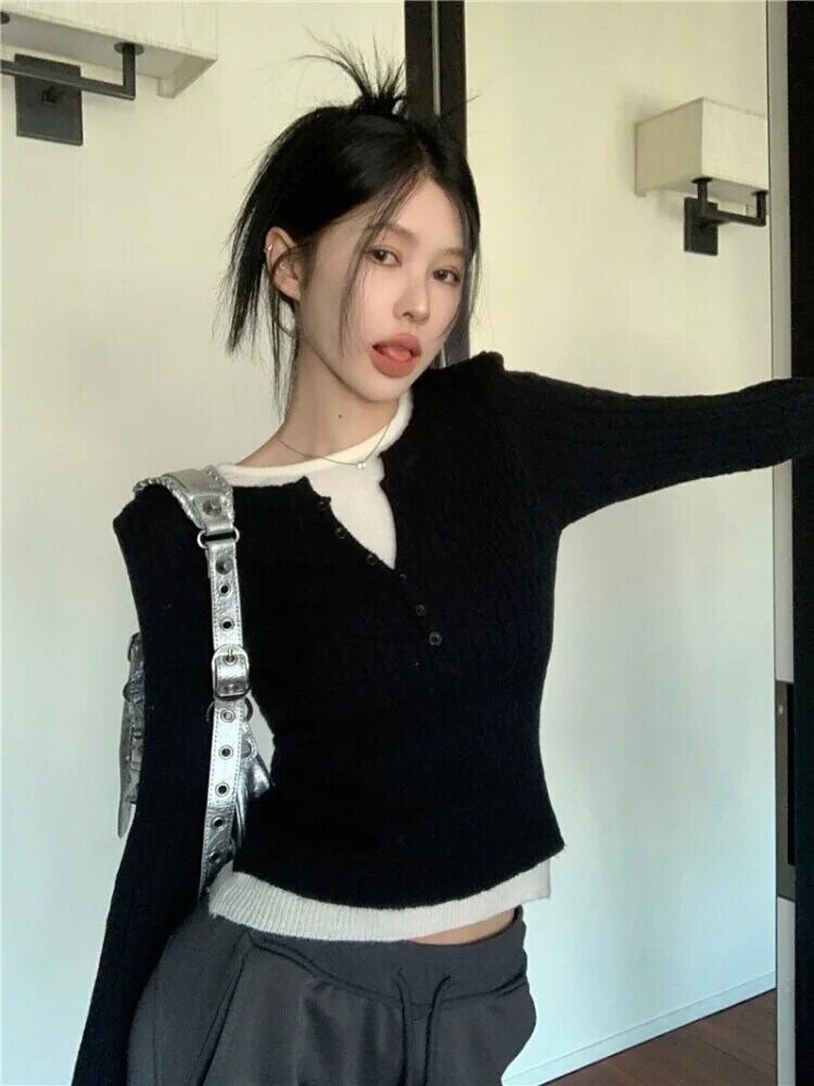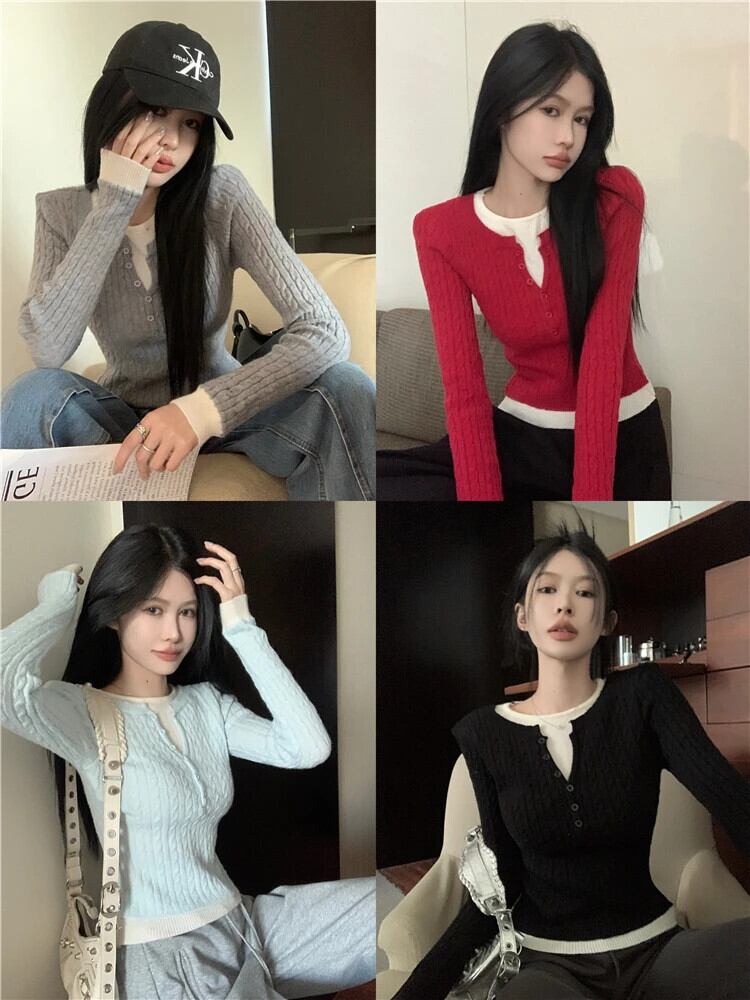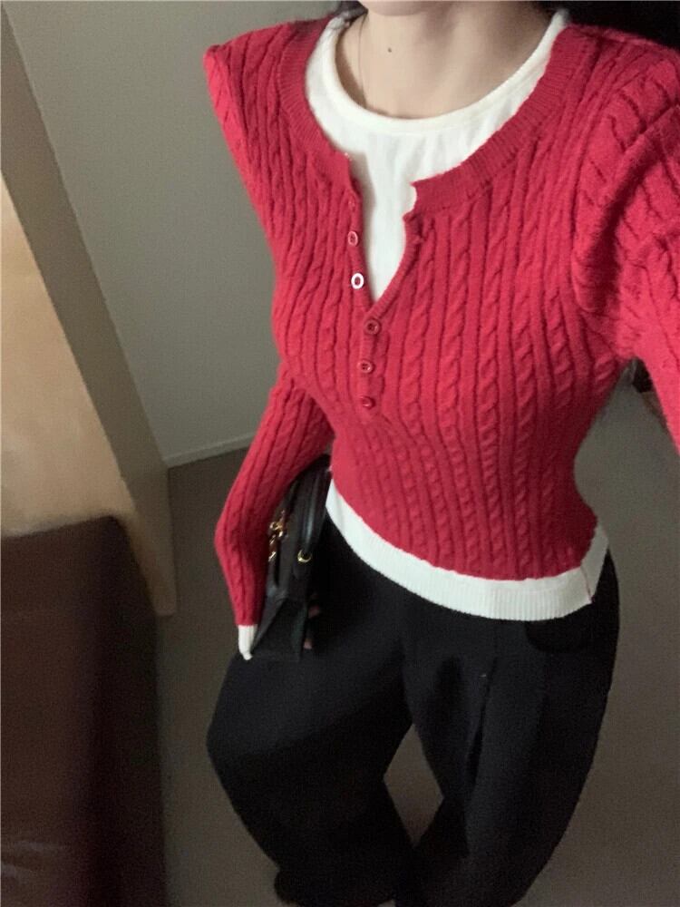 Sweet Girl カラーコントラストフェイクツーピースツイスト O ネックニット秋と冬タイト長袖ボトリングセーター ロング 大人ガーリー スウィート キュート カジュアル オータム 秋物 ウィンター 冬物 Oネック