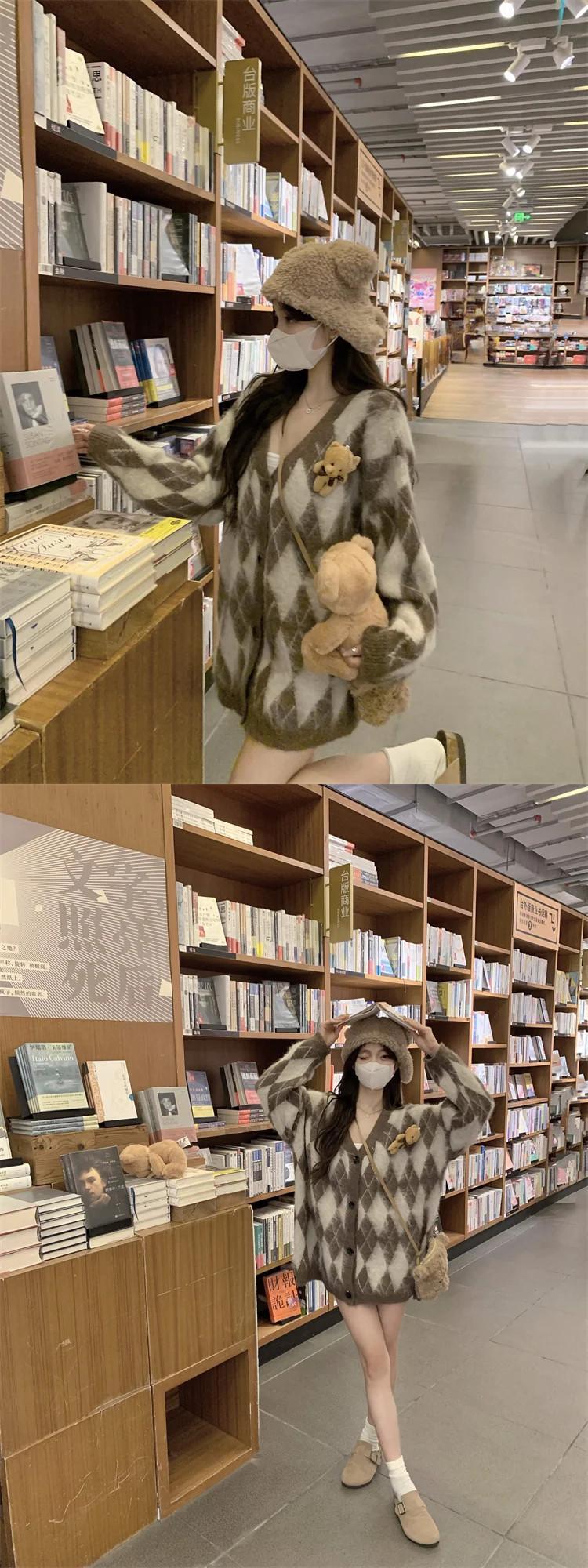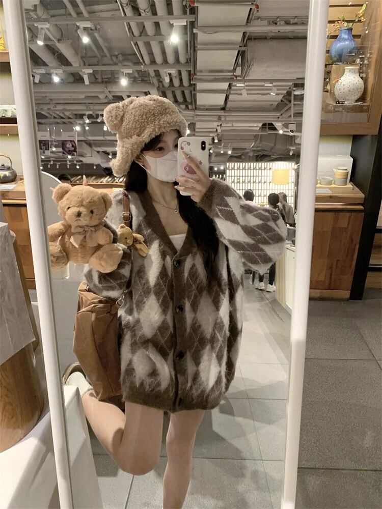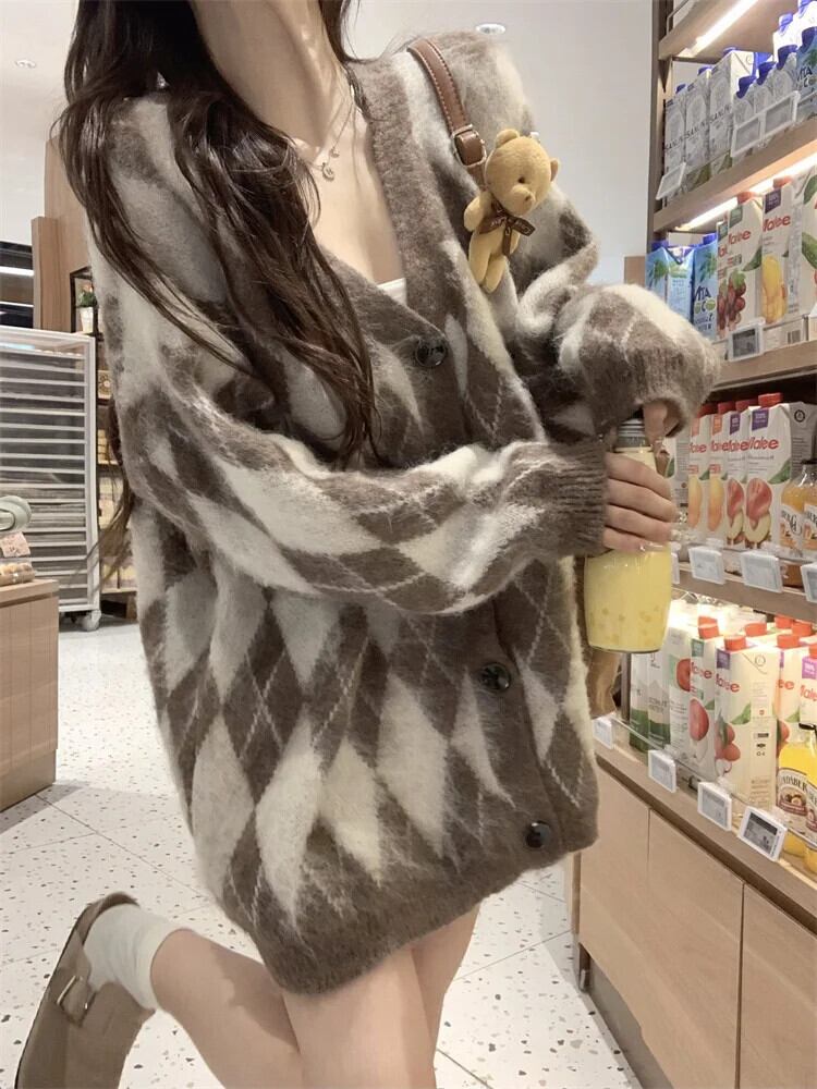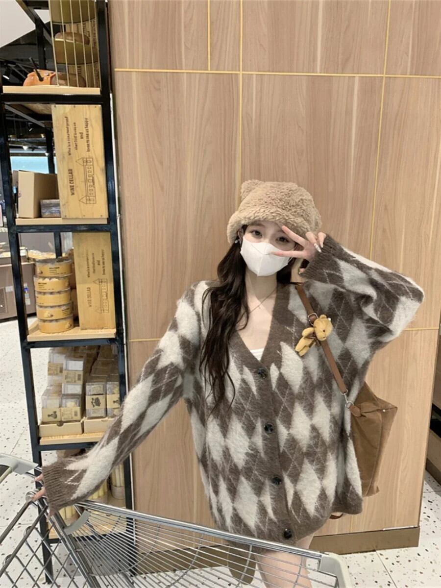 甘いホットガールレトロ菱形 V ネックニットカーディガン春長袖ルーズセーター ロング 大人ガーリー スウィート キュート カジュアル スプリング 春物 Vネック