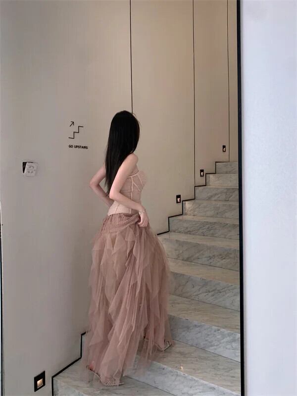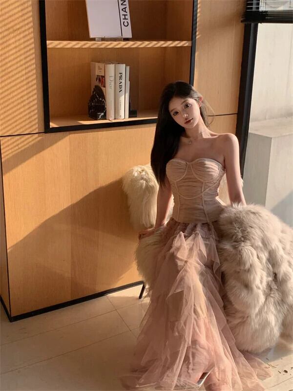 甘いホットガールスーツ冬純粋セクシーストラップレスベストトップメッシュふわふわロングスカートツーピースセット 大人ガーリー スウィート キュート カジュアル ウィンター 冬物 ピュア
