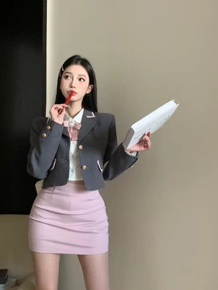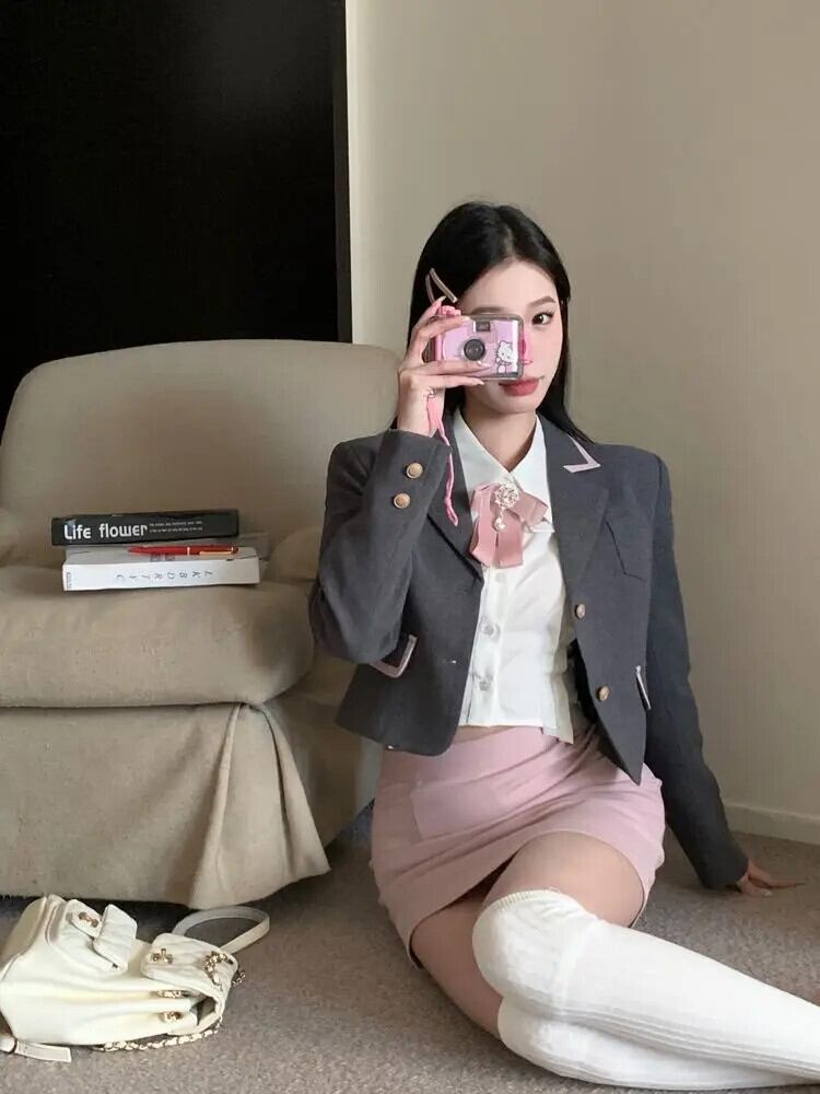 スイートホットガールプレッピースタイルスーツ春ターンダウンカラーコートショートシャツウエストミニスカート 3 点セット 大人ガーリー スウィート キュート カジュアル スプリング 春物