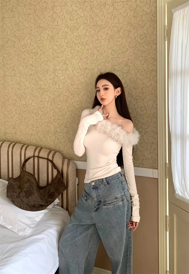 ホットガール純粋セクシー毛皮スプライシングオフショルダーニットシャツ春スリムフィットショートボトリングトップ スプリング 春物 ピュア