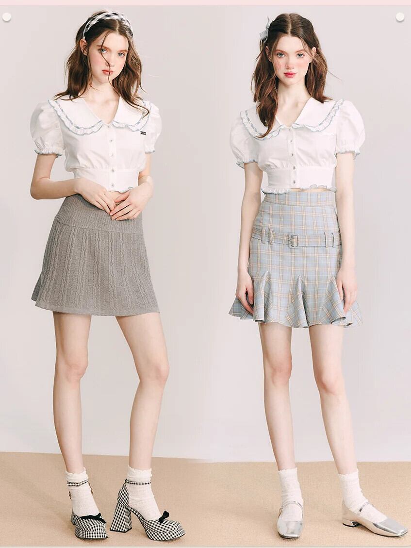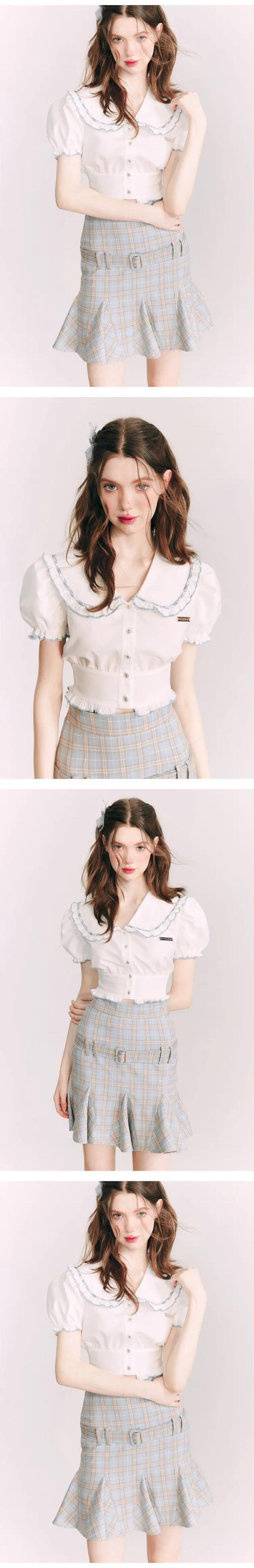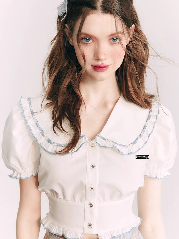 甘いホットガールバブルスリーブシャツ夏ピーターパン襟スリムフィット半袖シャツ 大人ガーリー スウィート キュート カジュアル サマー 夏物