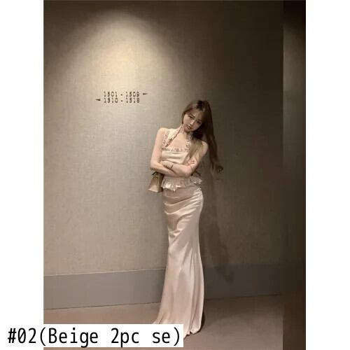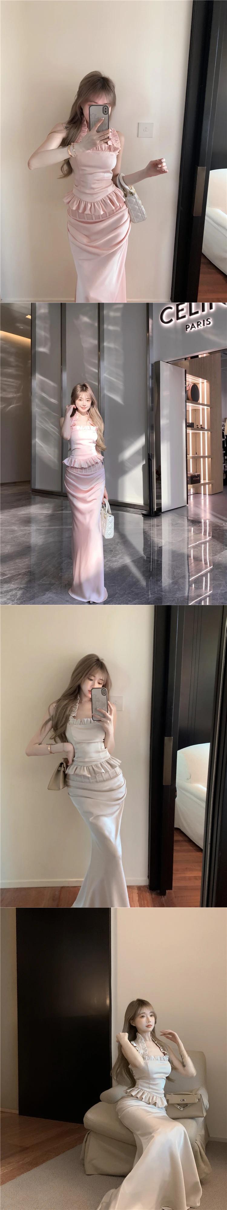 甘いホットガールスーツ春フリルホルターネックベストマーメイドラップヒップロングスカートツーピースセット 大人ガーリー スウィート キュート カジュアル スプリング 春物