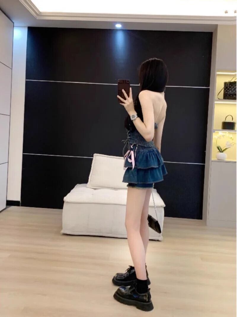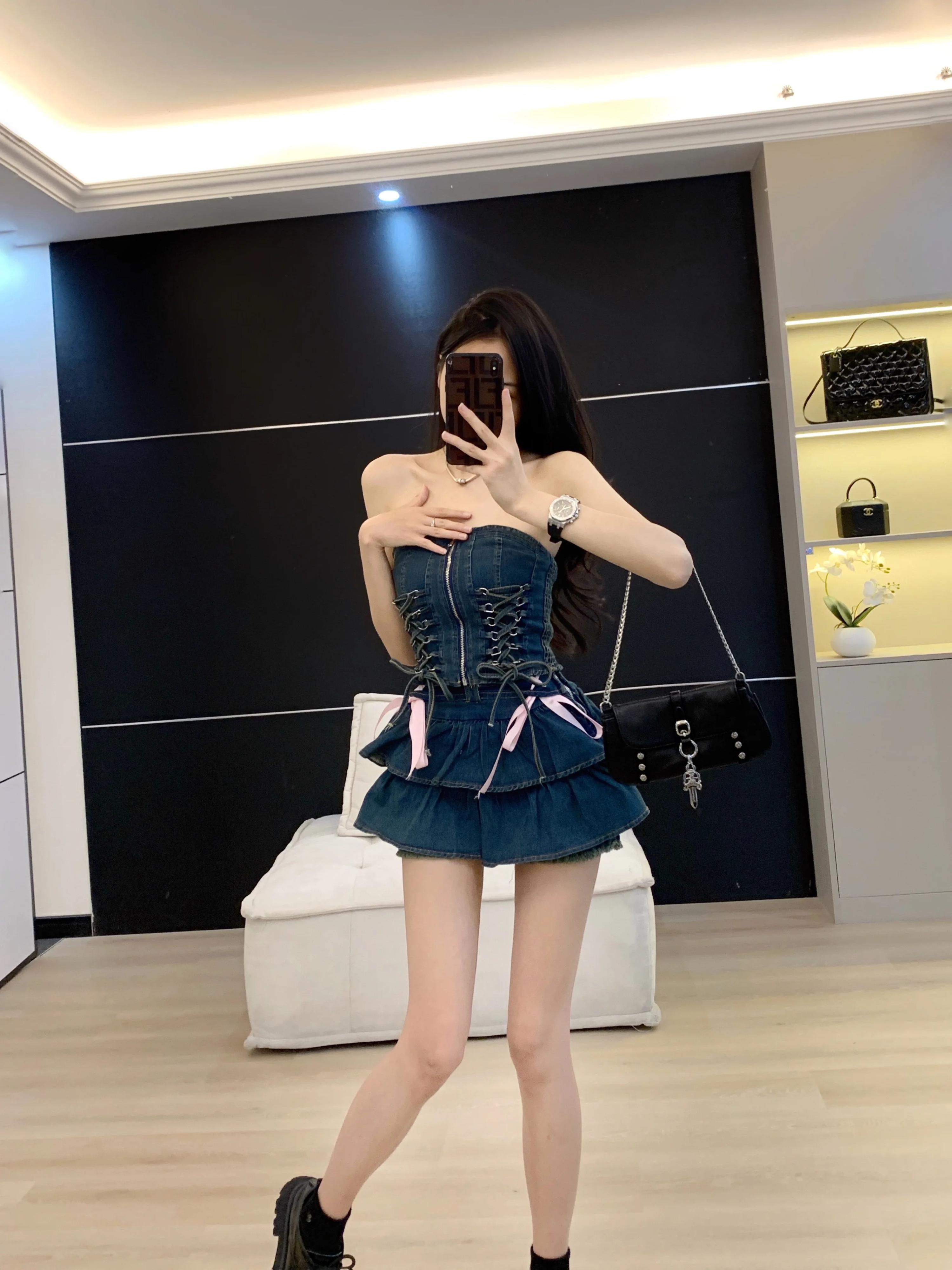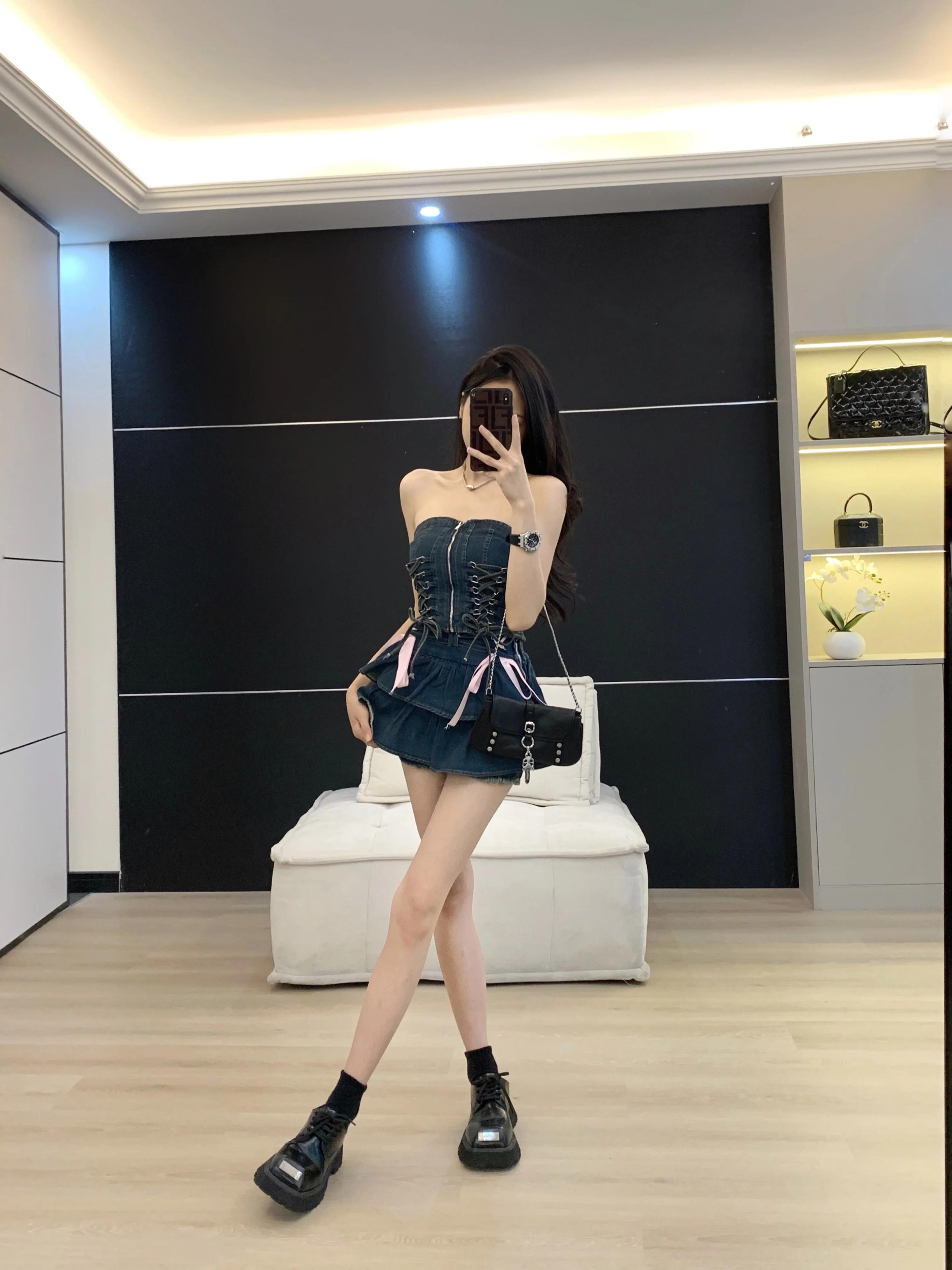 甘いホットガールスーツ春ストラップレスデニムショートベスト A ラインプリーツミニスカート 2 点セット 大人ガーリー スウィート キュート カジュアル スプリング 春物 Aライン