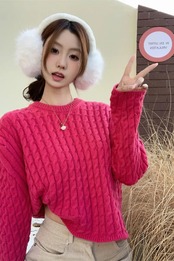 甘いホットガール O ネックツイストショートセーター冬長袖ルーズニットプルオーバートップ ロング 大人ガーリー スウィート キュート カジュアル ウィンター 冬物 Oネック