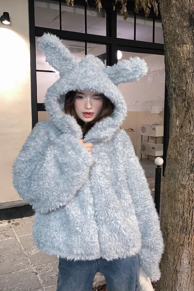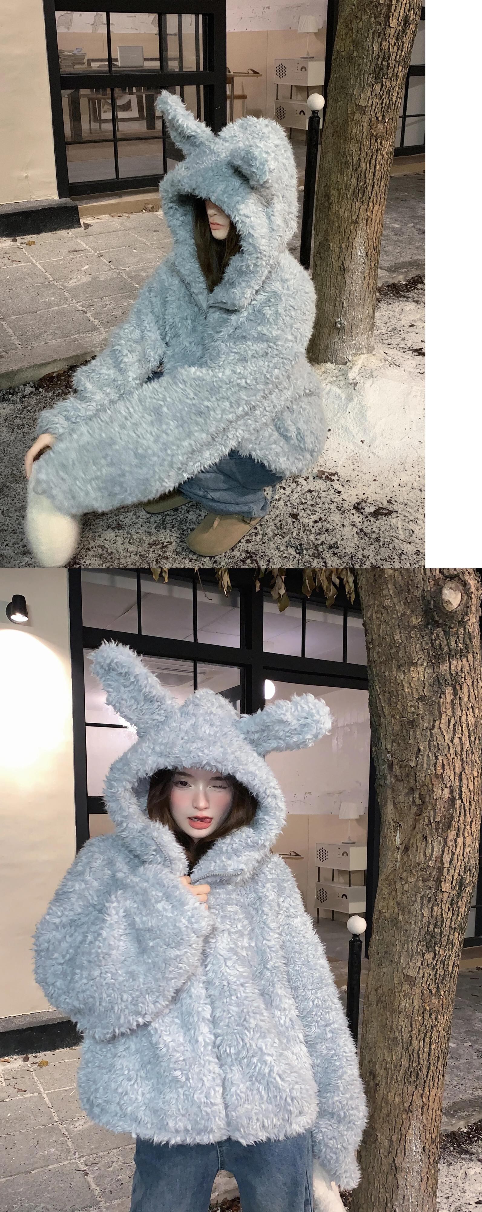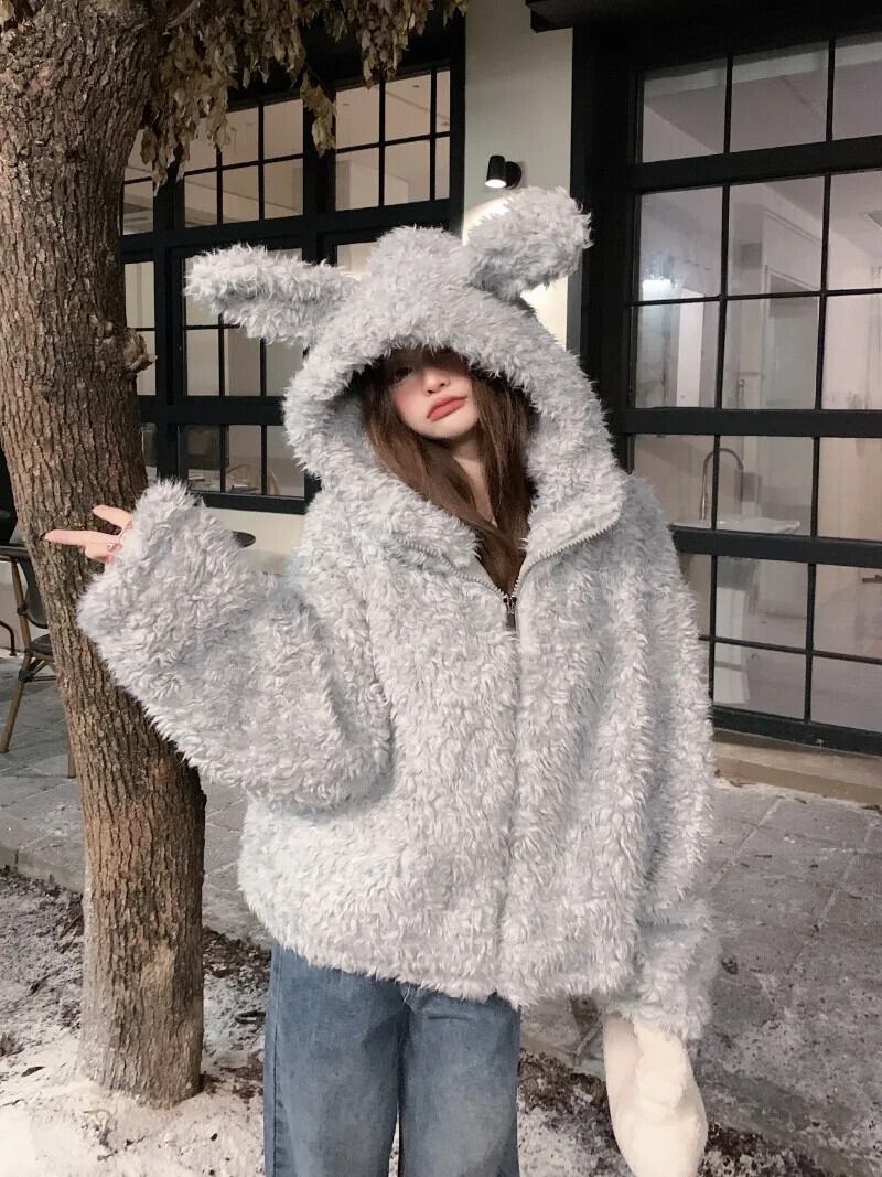 アメリカンレトロかわいいウサギ耳フード付きぬいぐるみジャケット秋と冬ルーズフィットぬいぐるみトレーナー 大人ガーリー スウィート キュート カジュアル オータム 秋物 ウィンター 冬物