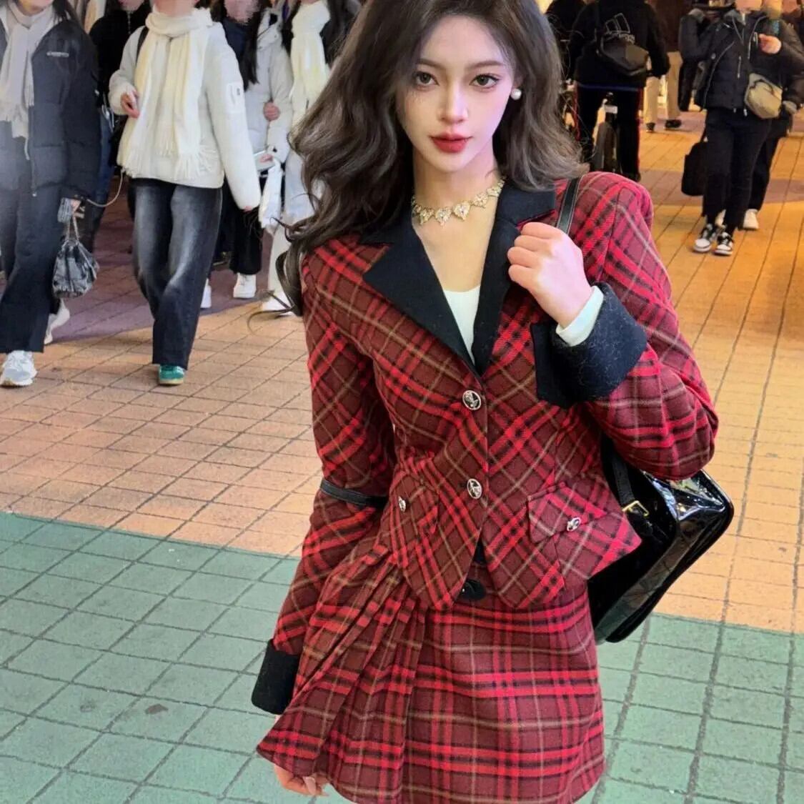 甘いホットガールレトロスーツ冬チェック柄スリムフィットジャケットウエスト A ラインミニスカート 2 点セット 大人ガーリー スウィート キュート カジュアル ウィンター 冬物 Aライン