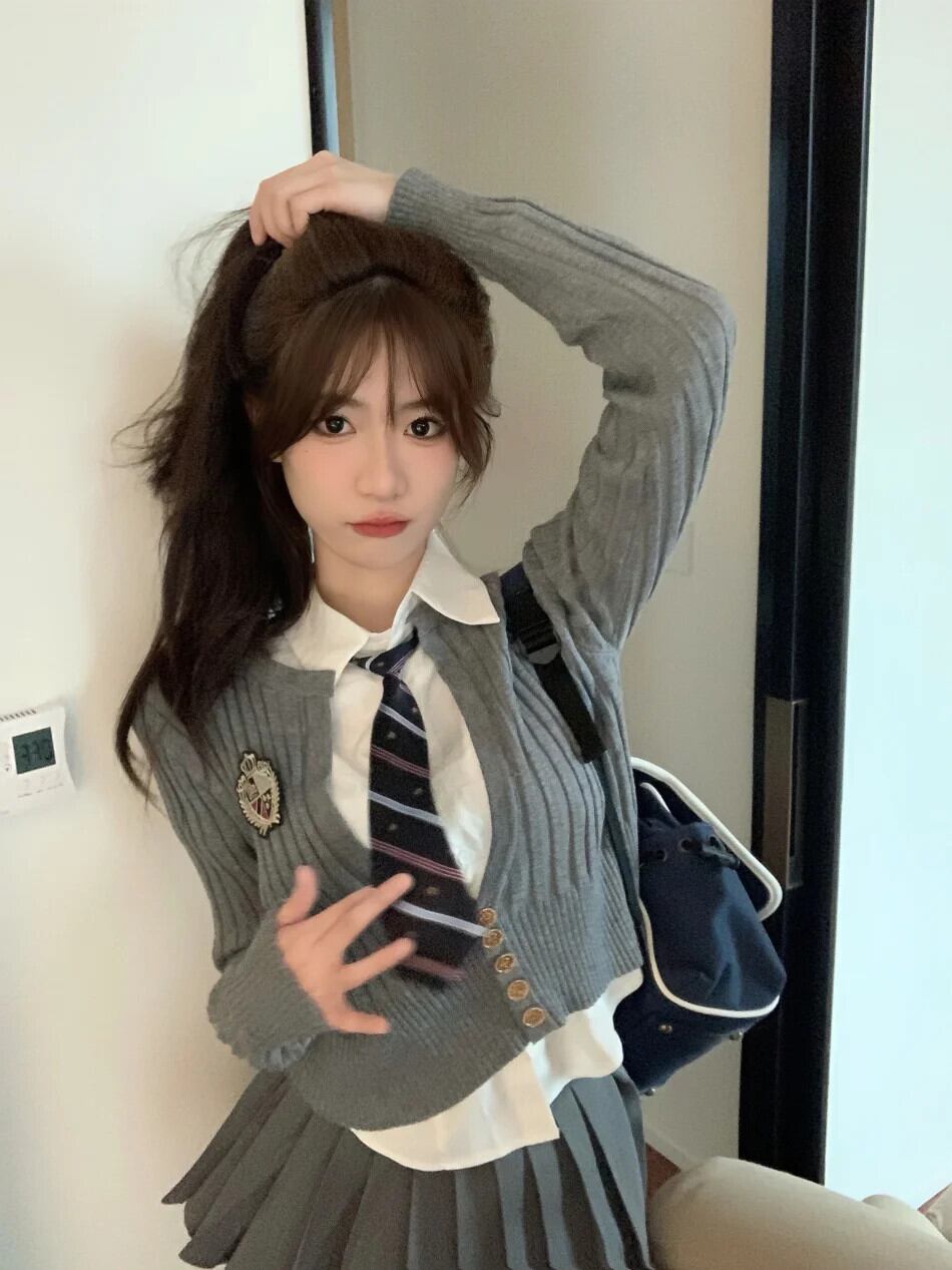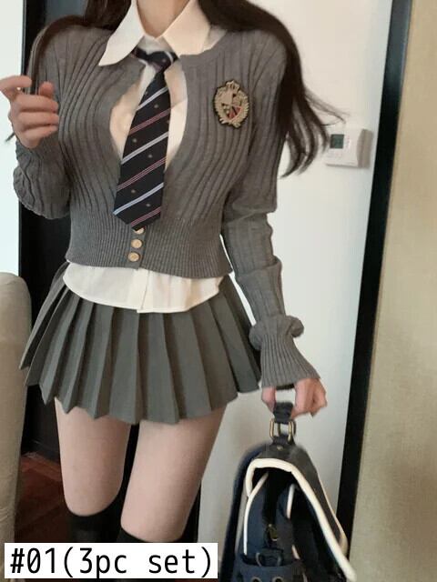 甘いホットガールプレッピースタイルスーツ春ニットカーディガンシャツプリーツ A ラインスカート 3 点セット 大人ガーリー スウィート キュート カジュアル スプリング 春物 Aライン