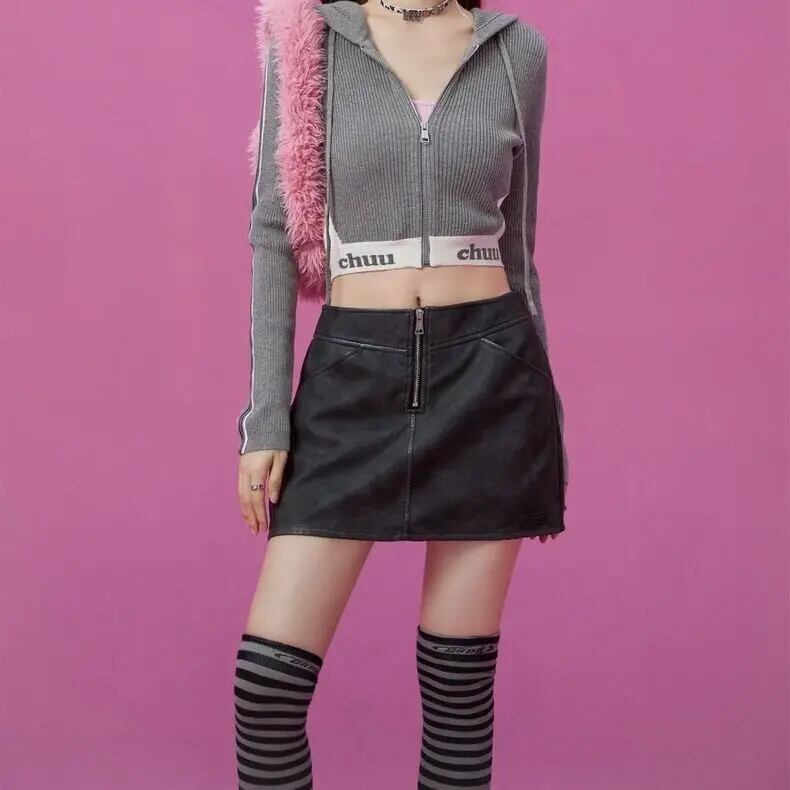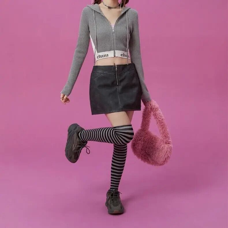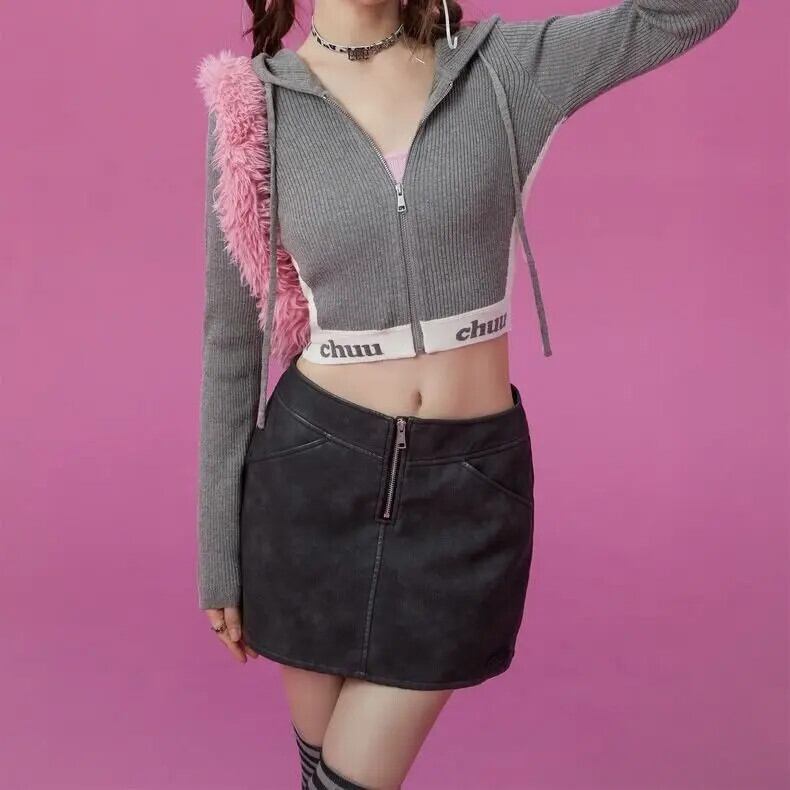 甘いホットガールレターコントラストカラーパッチワークジャケット春巾着フード付きニット長袖ショートトップ ロング 大人ガーリー スウィート キュート カジュアル スプリング 春物