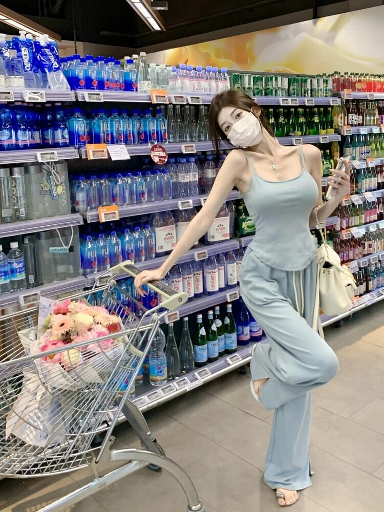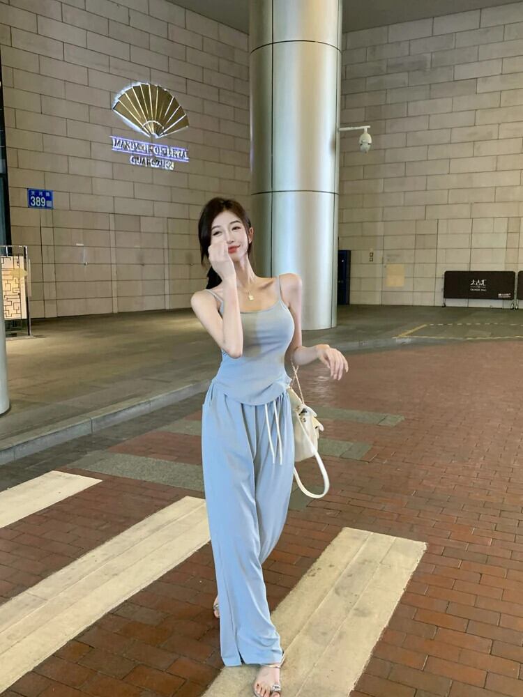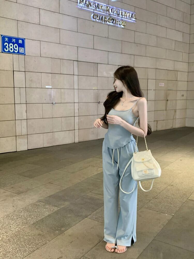 Sweet Girl セクシースーツ春ブルーキャミソールベストトップ巾着スプリットワイドレッグパンツ 2 点セット 大人ガーリー スウィート キュート カジュアル スプリング 春物 ワイドパンツ