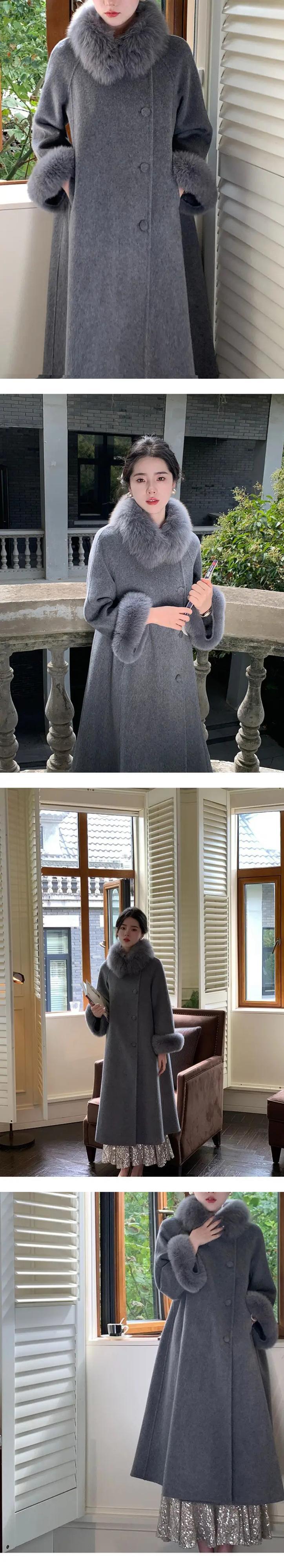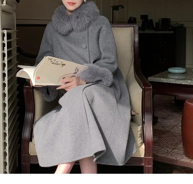フレンチウェットホットガールウールコート秋と冬毛皮襟/袖 A ラインウールロングコート オータム 秋物 ウィンター 冬物 Aライン