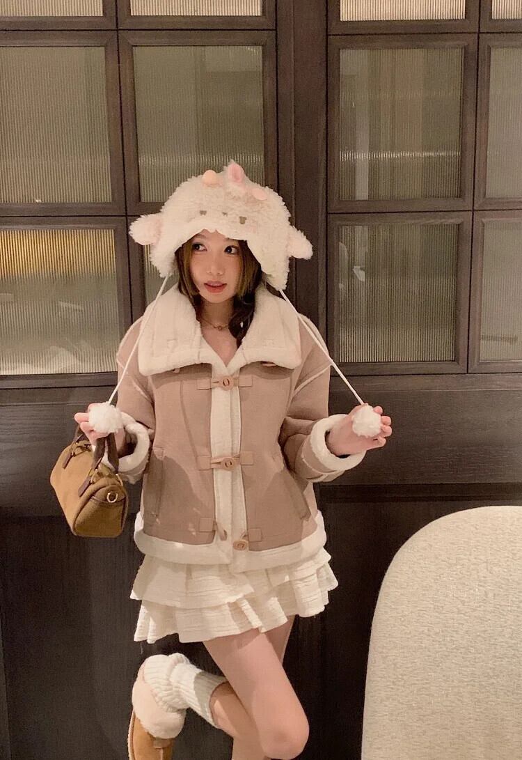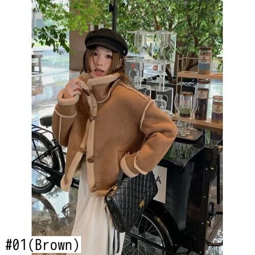 甘いホットガールラムファーパッチワークスエードジャケット秋と冬スタンドカラーオートバイジャケット スウェード 大人ガーリー スウィート キュート カジュアル オータム 秋物 ウィンター 冬物