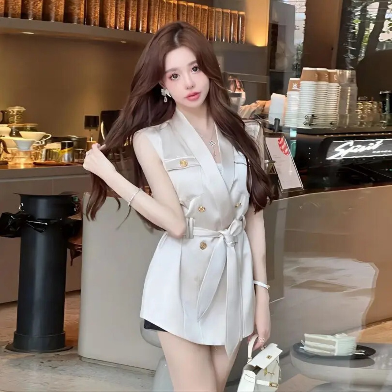 甘いホットガールスリムフィットレースアップベストジャケット夏ターンダウン襟ノースリーブシャツ 大人ガーリー スウィート キュート カジュアル サマー 夏物