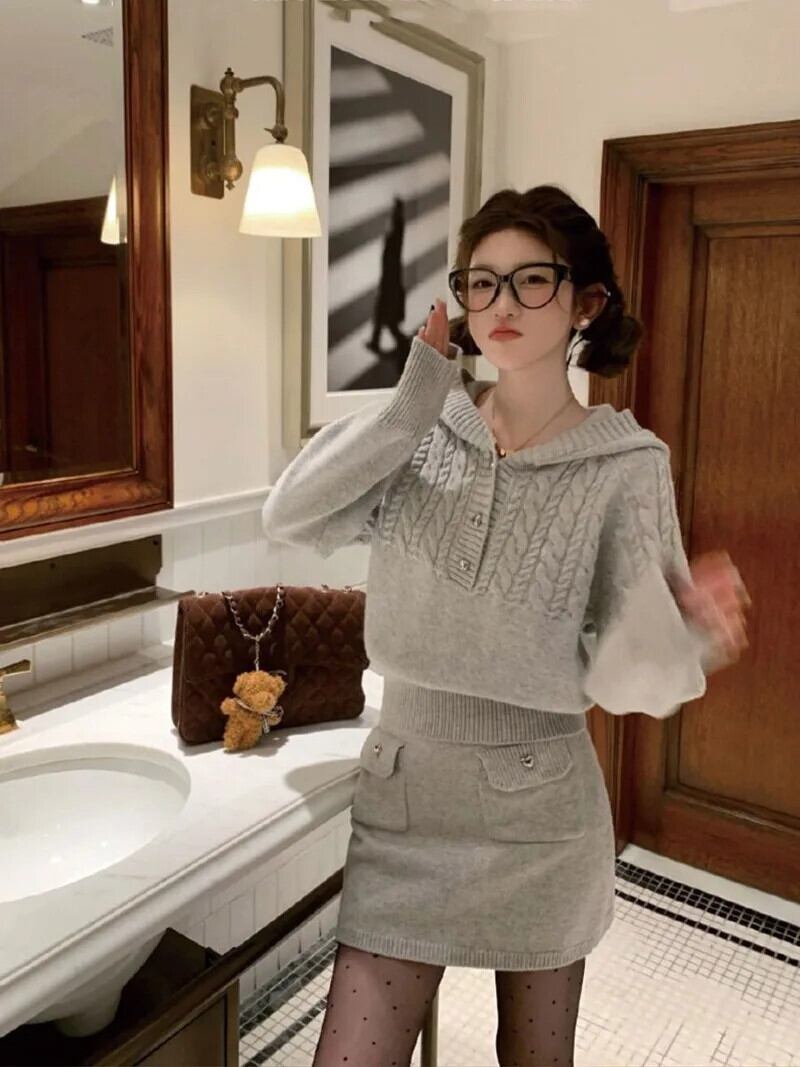 甘いホットガールスーツ春ツイストグレーニットフード付きプルオーバーウエストスカートツーピースセット 大人ガーリー スウィート キュート カジュアル スプリング 春物