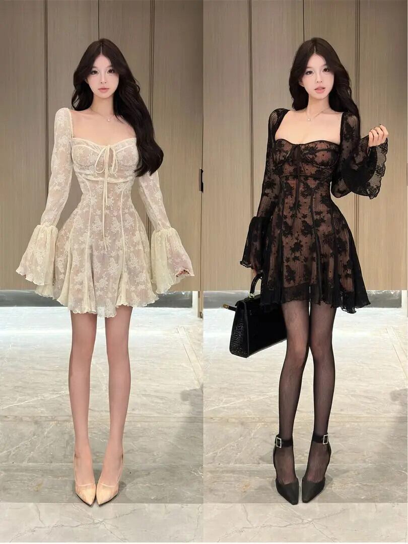 Sweet Girl レースアップ スリムフィットドレス レディース 春 ピュアセクシー スクエアカラー フレアスリーブ ショートドレス レッド 大人ガーリー スウィート キュート カジュアル スプリング 春物 スクウェア