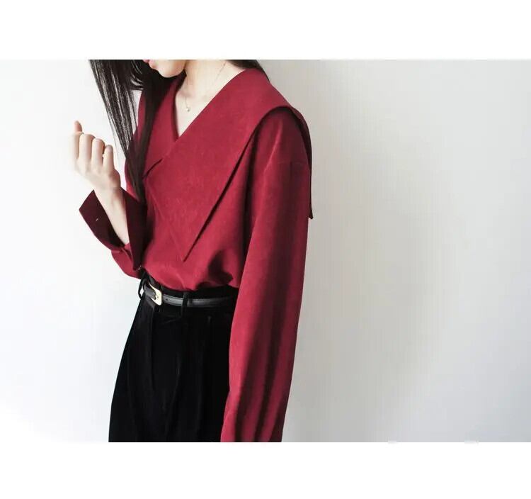 オフィスレディ通勤レトロターンダウンカラーシャツ春赤ルーズフィット長袖シャツ ロング レッド スプリング 春物 会社 学校 通勤や通学にも