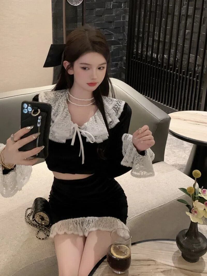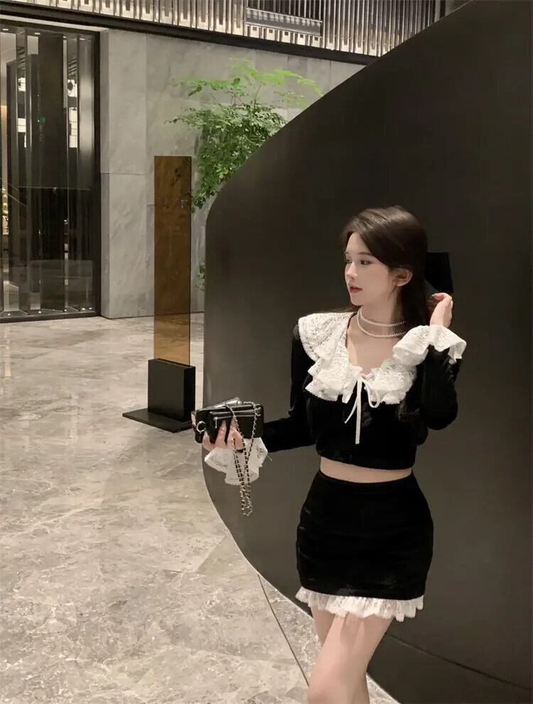 フレンチホットガールスーツ春レースパッチワークショートベルベットトップ尻ラップミニスカートツーピースセット スプリング 春物