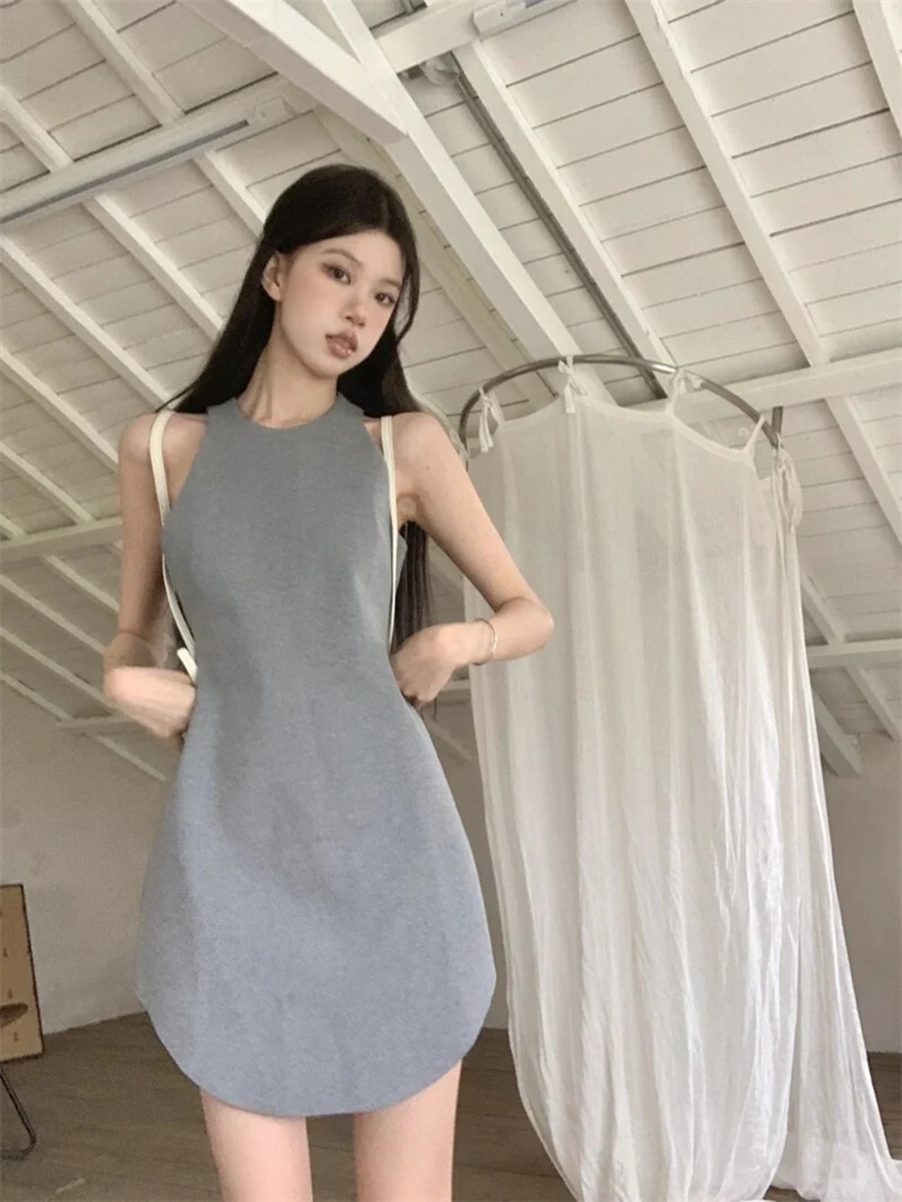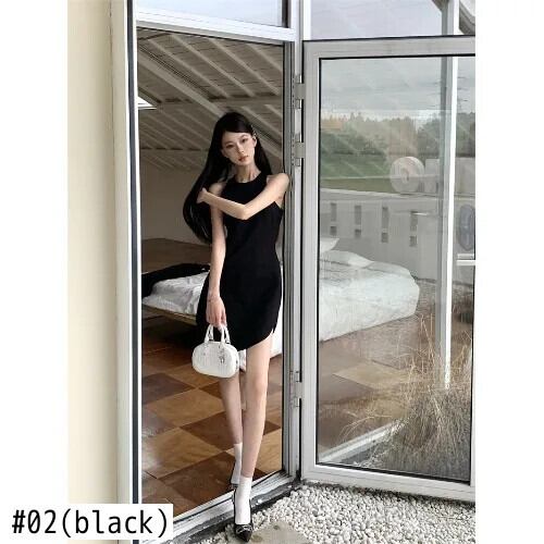 甘いホットガール不規則ソリッドカラードレス春ミッドレングスラウンドネックノースリーブスリムフィットドレス 大人ガーリー スウィート キュート カジュアル スプリング 春物 Oネック