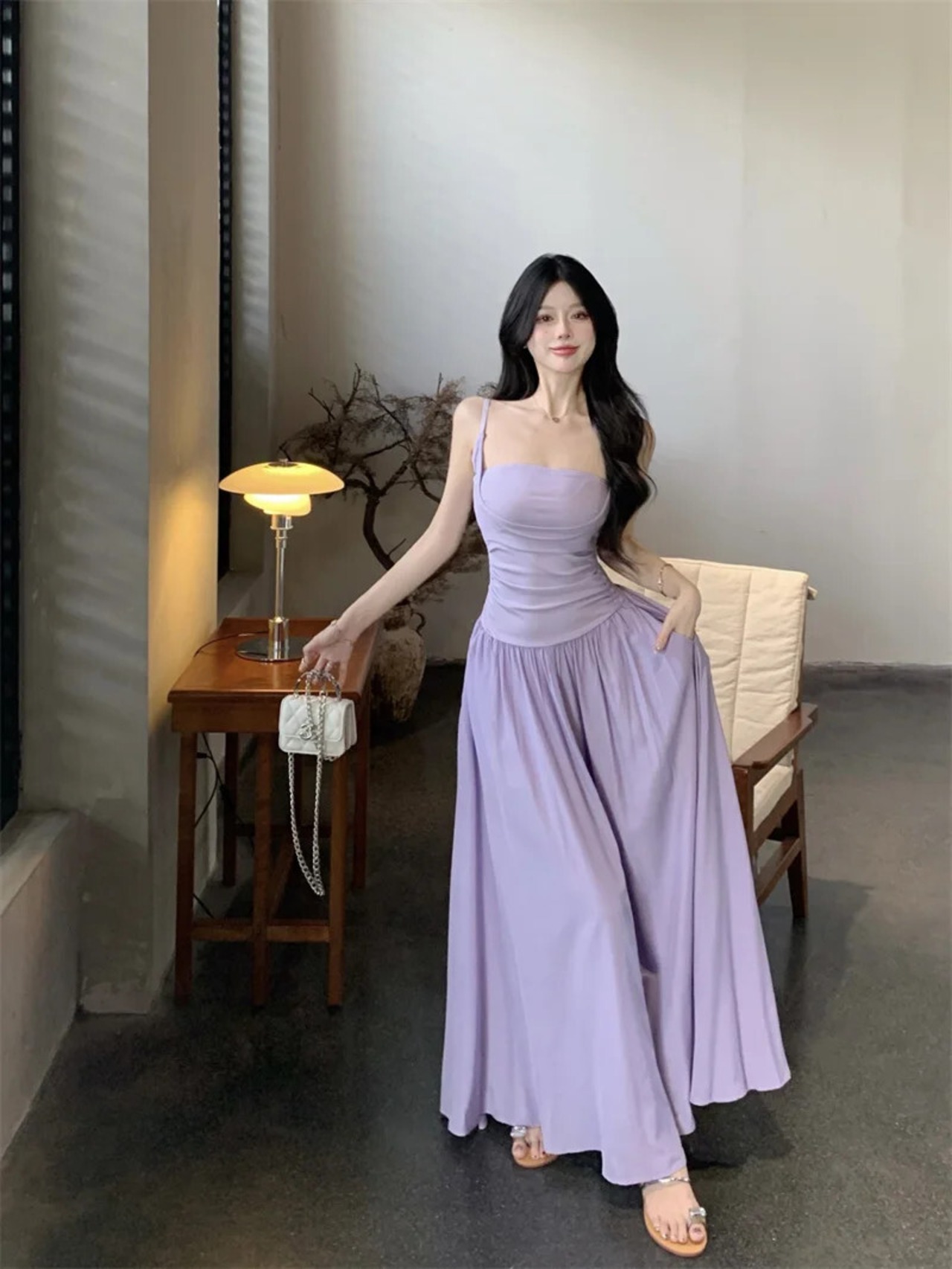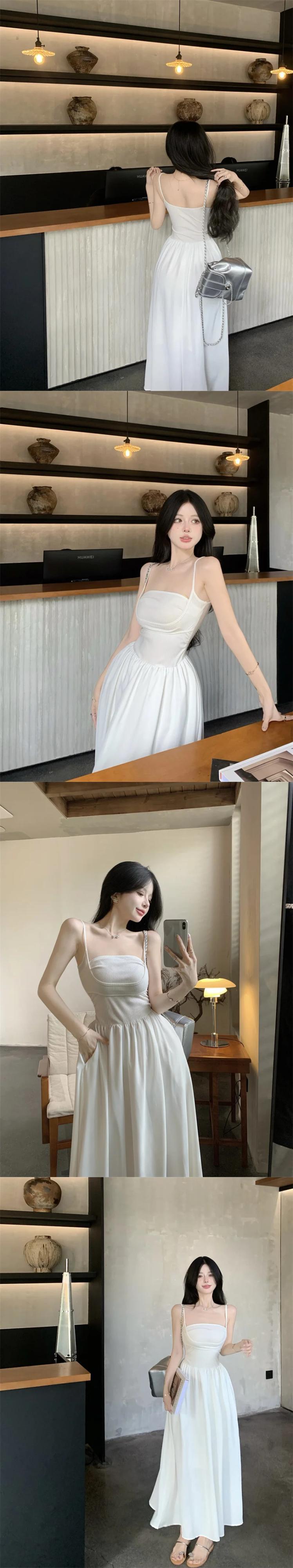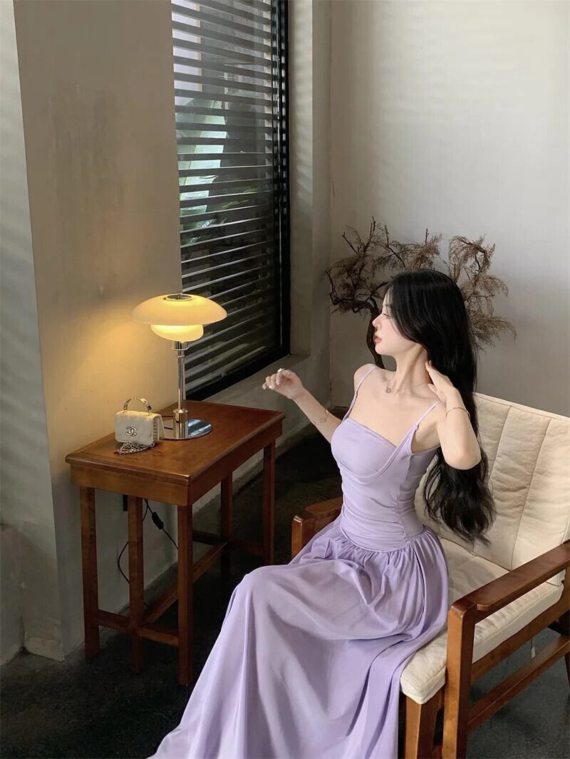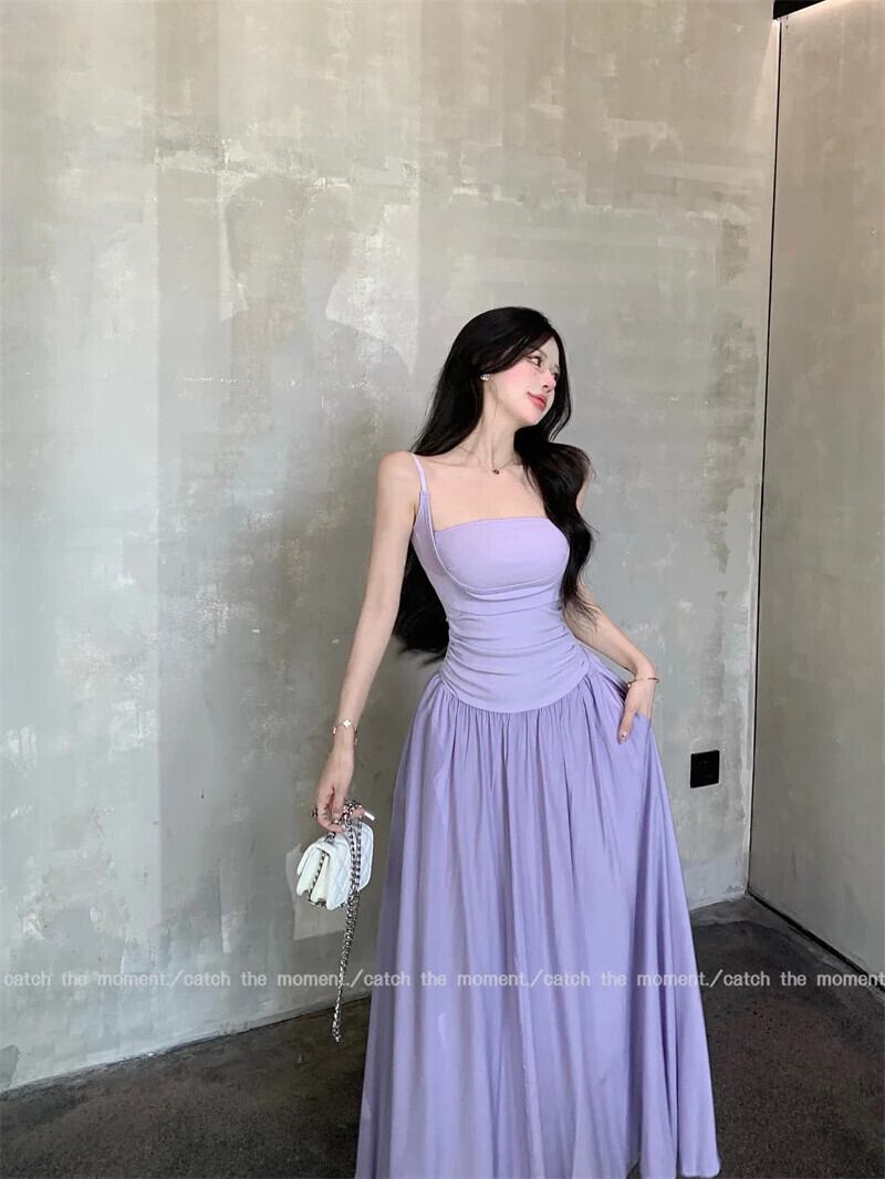 甘いホットガールソリッドカラープリーツドレス春スリムフィット底ストラップ A ラインロングドレス 大人ガーリー スウィート キュート カジュアル スプリング 春物 Aライン