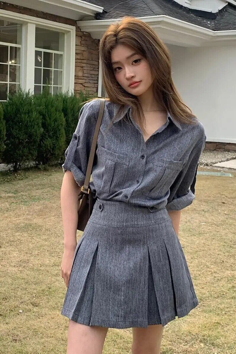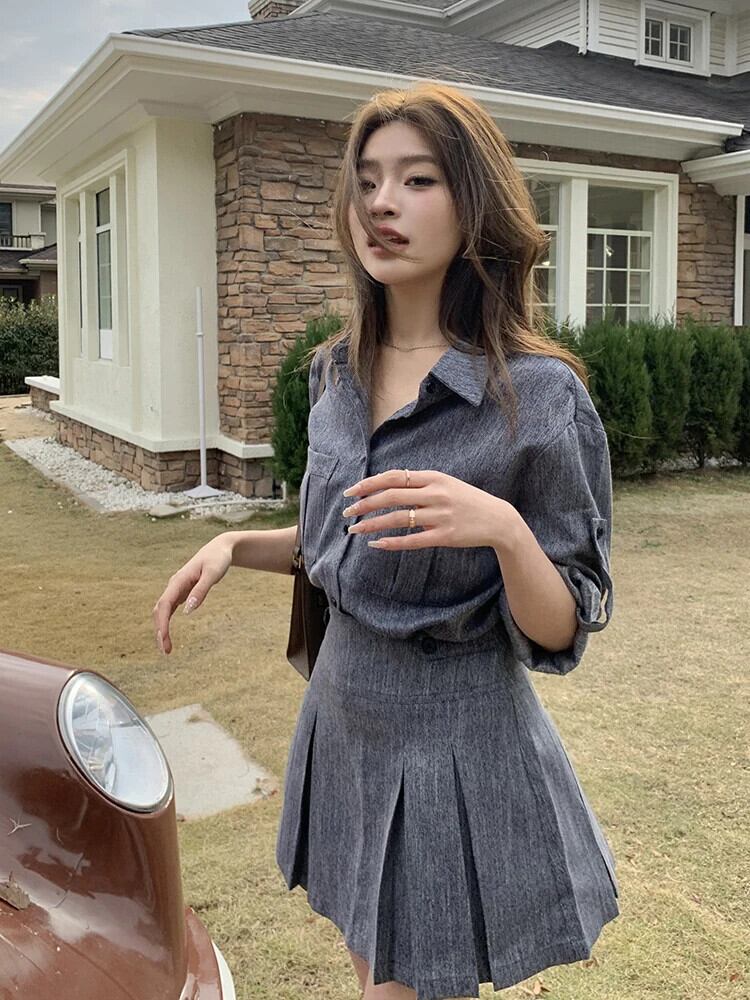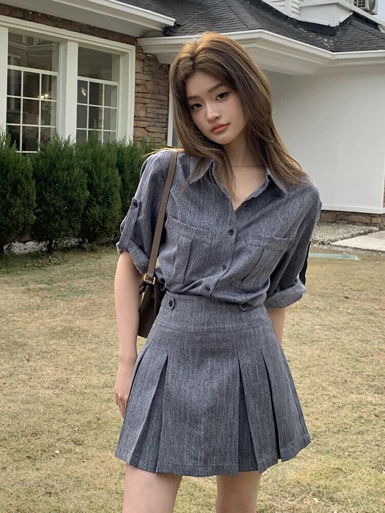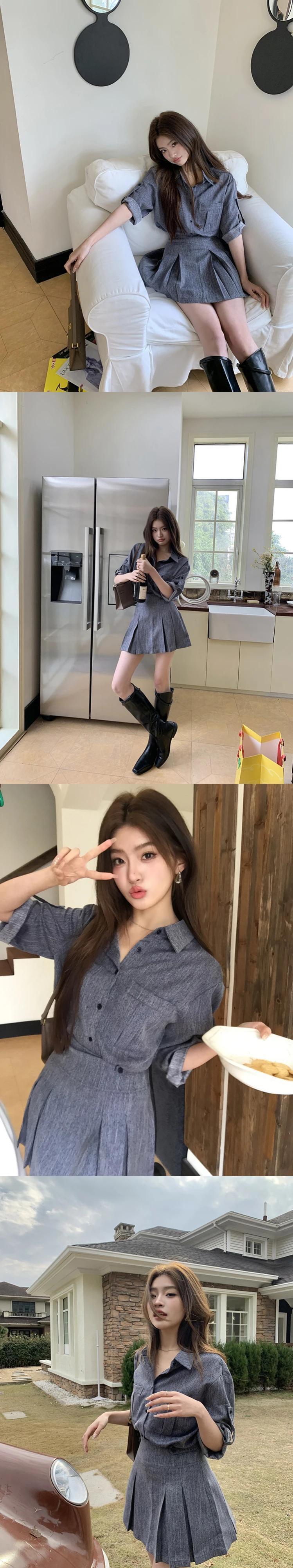 甘いホットガールスーツ夏通勤イミテーションデニムシャツウエストプリーツショートスカートツーピースセット 大人ガーリー スウィート キュート カジュアル サマー 夏物