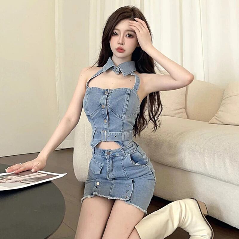 甘いホットガールセクシースーツ春夏ネックホルターショートデニムトップウエスト臀部ラップスカート 2 点セット 大人ガーリー スウィート キュート カジュアル スプリング 春物 サマー 夏物