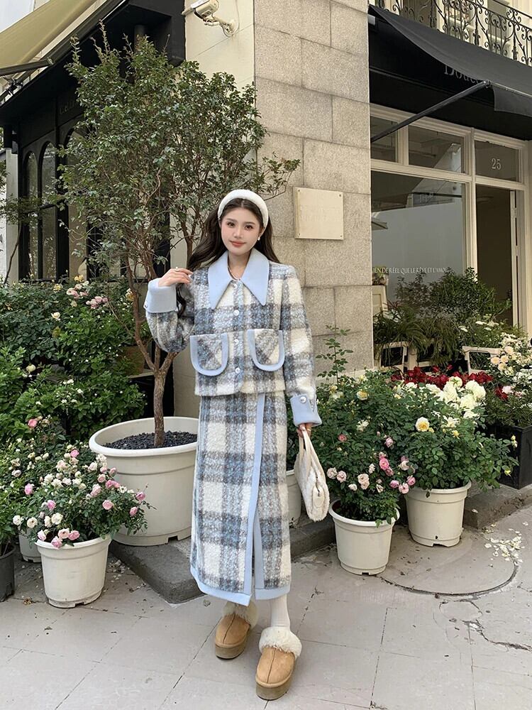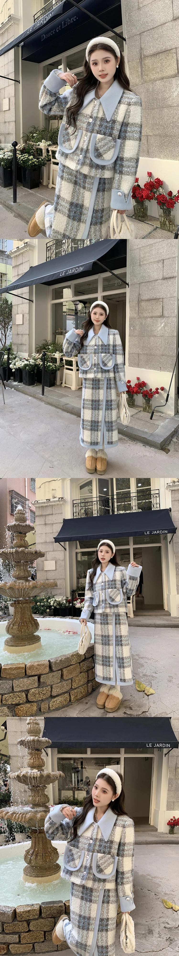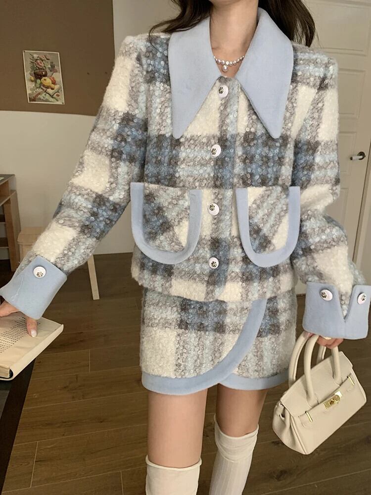 甘いホットガールスーツ冬チェック柄コットンウールショートジャケットウエストミニスカートツーピースセット 大人ガーリー スウィート キュート カジュアル ウィンター 冬物