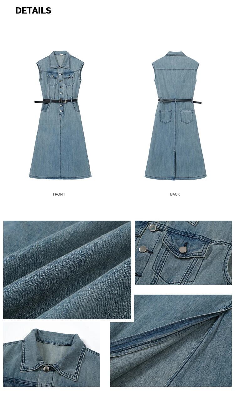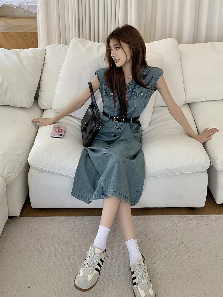 甘いホットガールレトロノースリーブロングデニムドレスレディース春ラペルシングルブレストドレスベルト 大人ガーリー スウィート キュート カジュアル スプリング 春物 ハーネス