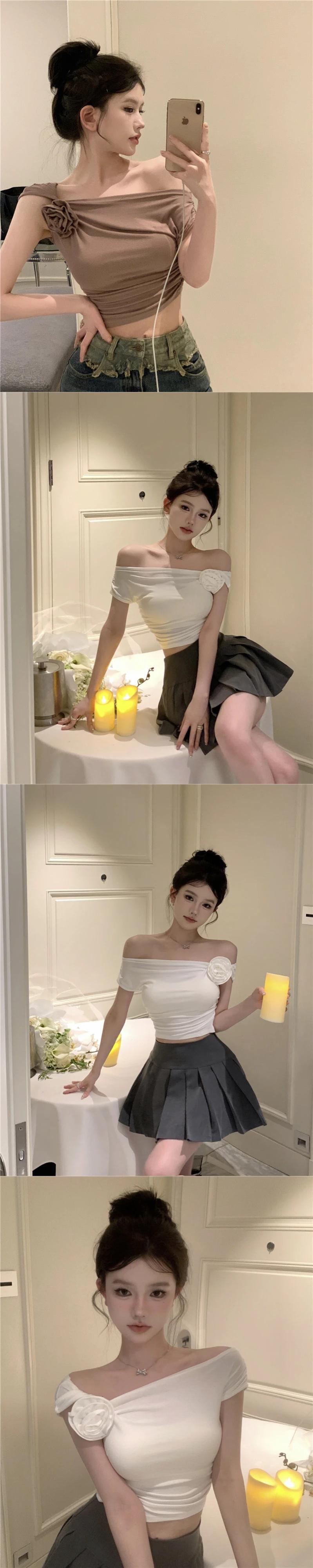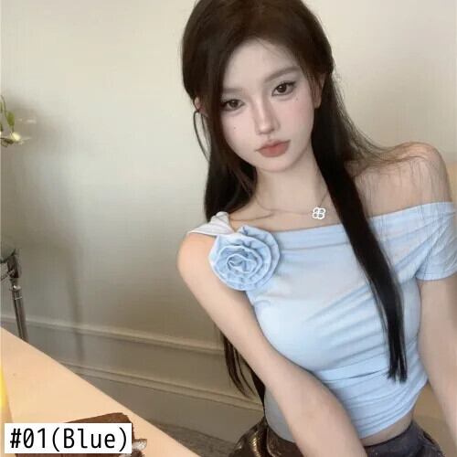 甘いホットガールフラワースラッシュネックプリーツブルートップ夏純粋セクシータイト半袖 Tシャツ ショート ハーフスリーブ 大人ガーリー スウィート キュート カジュアル サマー 夏物 ピュア フラワーデザイン