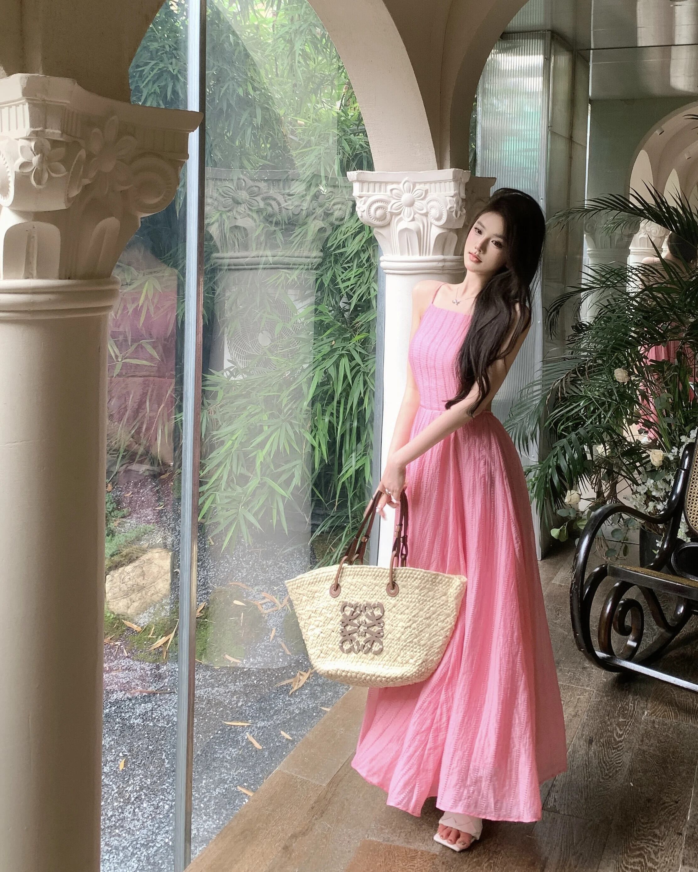 甘いホットガールピーチピンクノースリーブロングドレス春背中開いた妖精レースアップ大き裾ドレス 大人ガーリー スウィート キュート カジュアル スプリング 春物