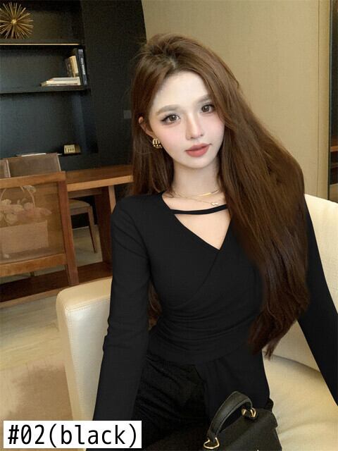 甘いホットガールクロス V ネック長袖 Tシャツ春不規則スリムフィットシックショートトップ ロング 大人ガーリー スウィート キュート カジュアル スプリング 春物 Vネック