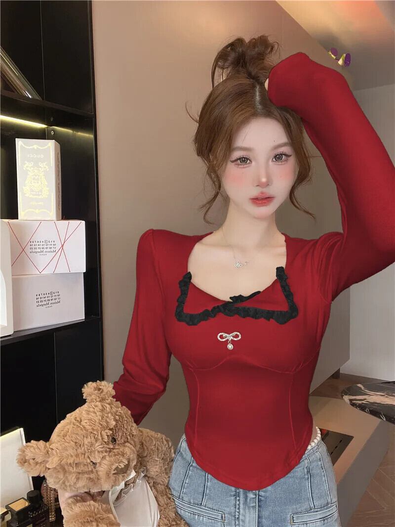 アメリカンスウィートホットガールレース長袖Tシャツ春スクエアカラーショートスリムフィットパールトップ ロング 大人ガーリー キュート カジュアル スプリング 春物 真珠 スクウェア