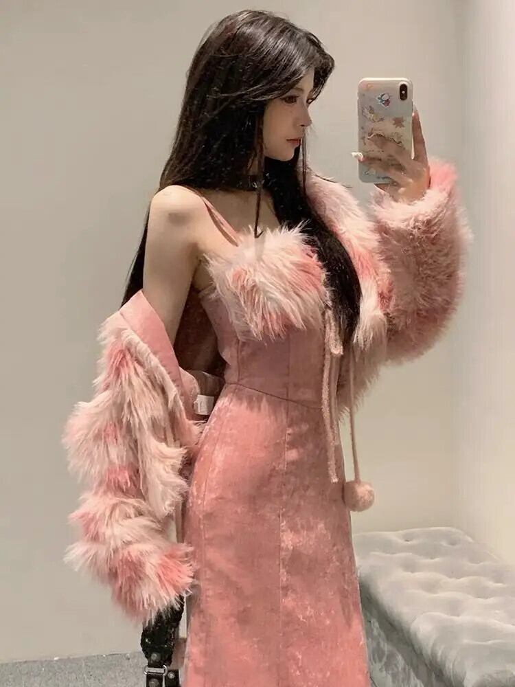 ピンク甘いホットガールスーツ春スタンドカラー豪華コートスリムフィットホルターストラップドレスツーピースセット 大人ガーリー スウィート キュート カジュアル スプリング 春物