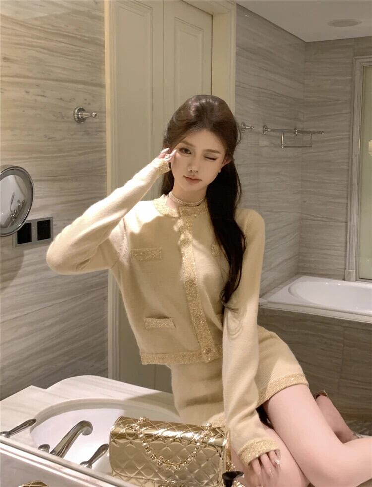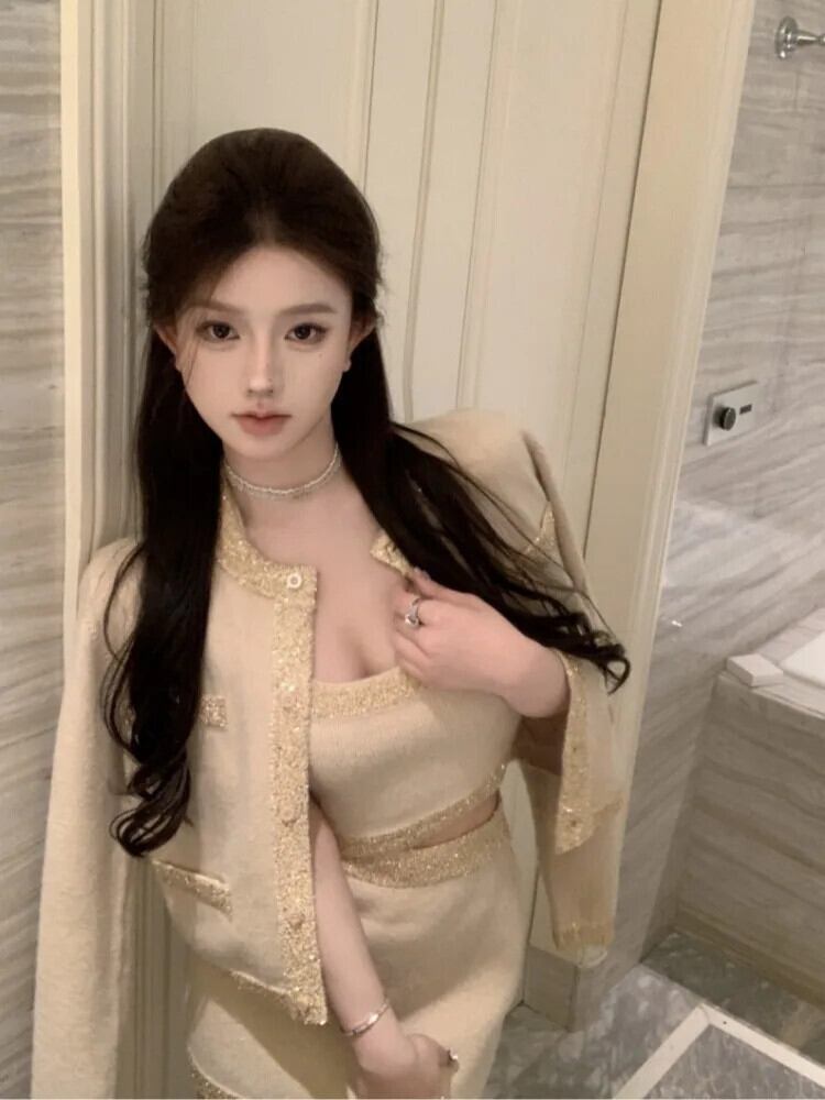 甘いホットガールスーツ春長袖ニットカーディガンキャミソールトップヒップラップスカート 3 点セット ロング 大人ガーリー スウィート キュート カジュアル スプリング 春物