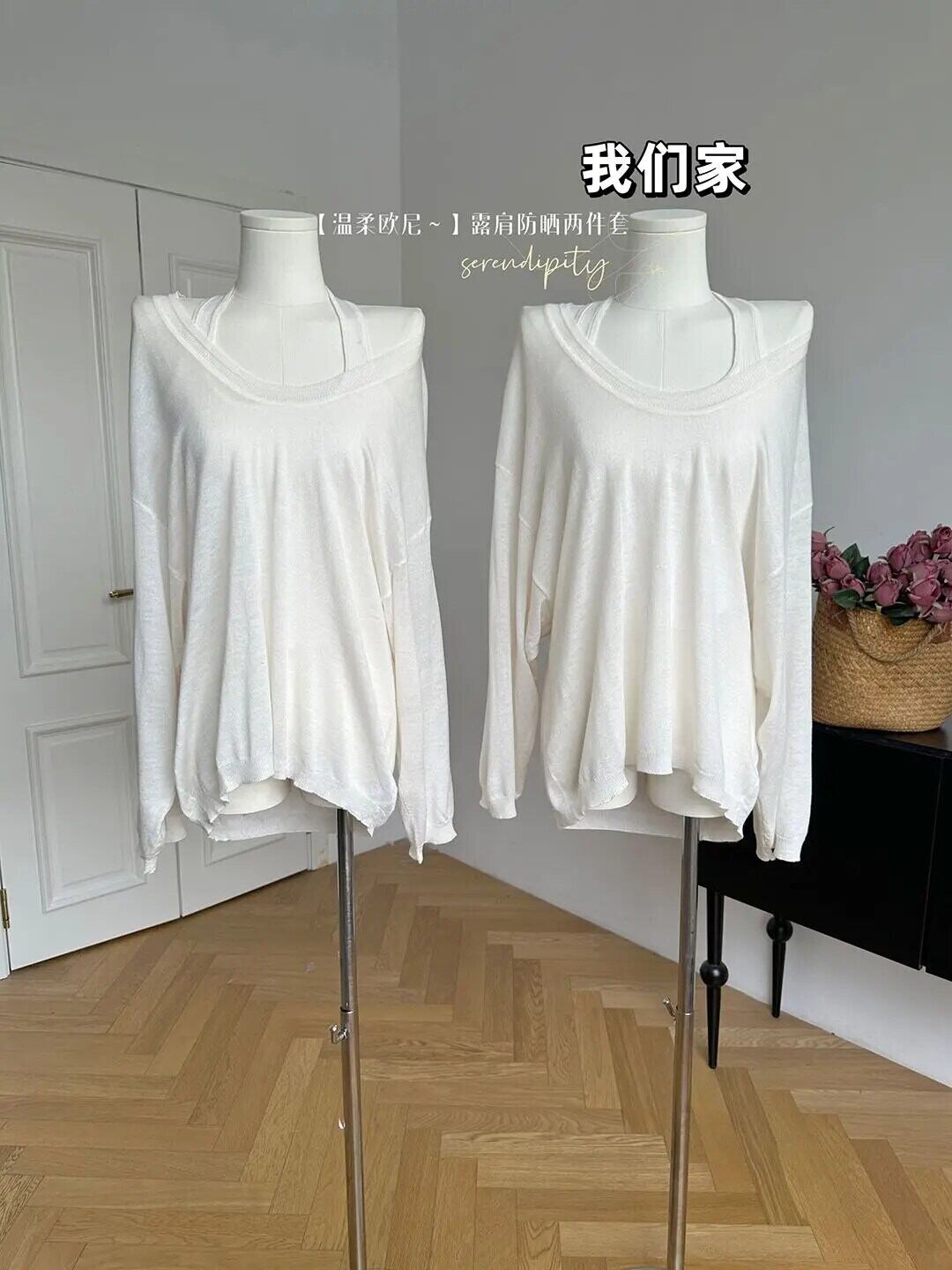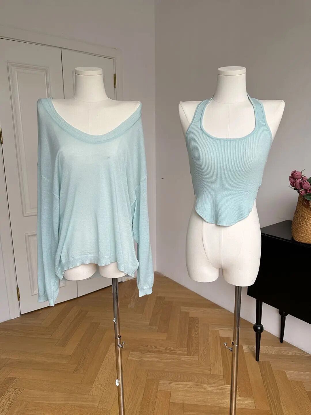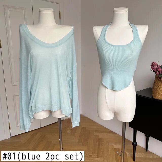 スイートホットガールスーツ春オフショルダーニットホルターネックストラップトップツーピースセット 大人ガーリー スウィート キュート カジュアル スプリング 春物