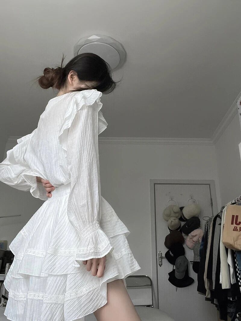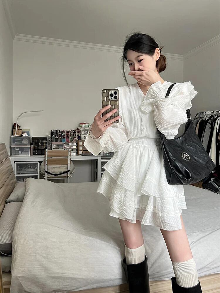 甘いホットガールスーツ春白フリルエッジシャツ弾性ウエスト A ラインミニスカート 2 点セット ホワイト エラスティック 伸縮 大人ガーリー スウィート キュート カジュアル スプリング 春物 Aライン