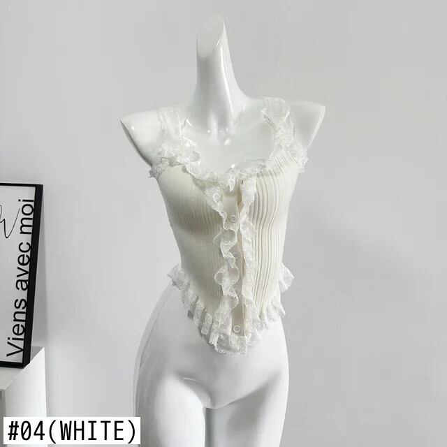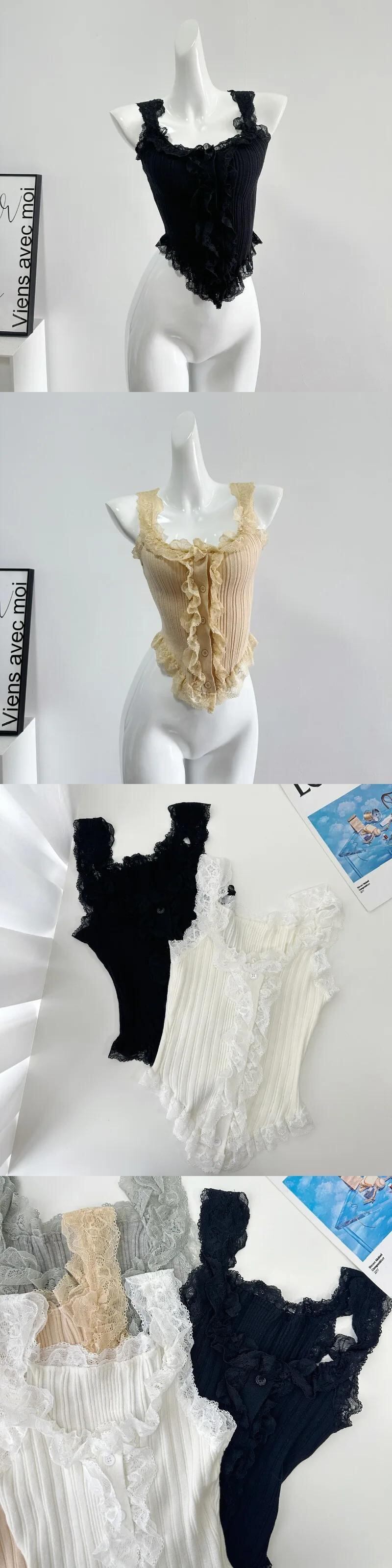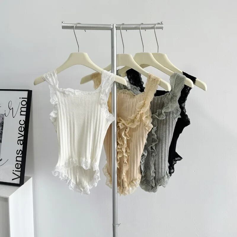 甘いホットガールレースニットストラップタンクトップ夏ショートフリルシングルブレストスリムフィットキャミソール 大人ガーリー スウィート キュート カジュアル サマー 夏物