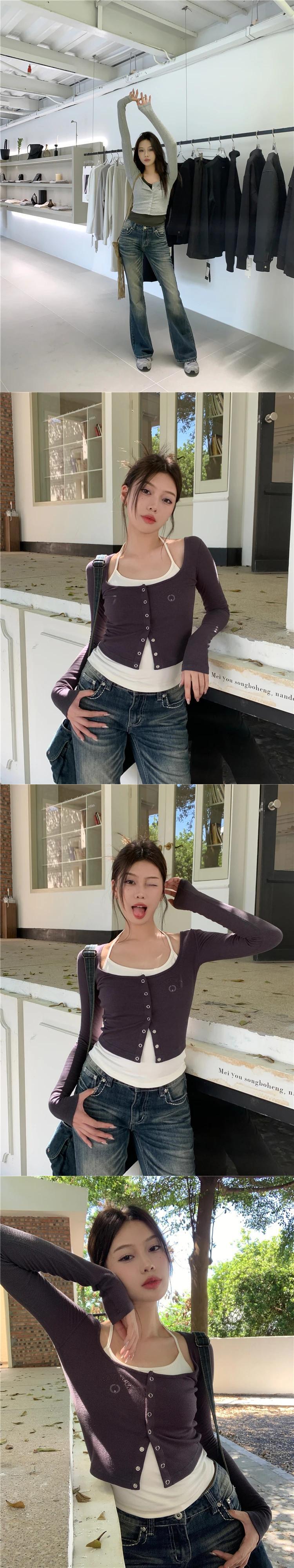 アメリカンスウィートホットガールレトロフェイクツーピースTシャツ春ホルターネック長袖スリムフィットトップ ロング 大人ガーリー キュート カジュアル スプリング 春物