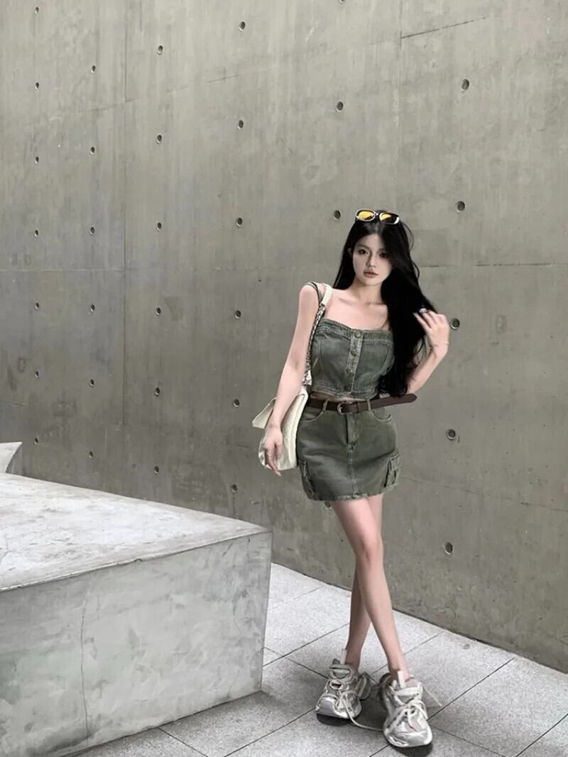 甘いホットガールスーツ春レトロデニムキャミソールウエストヒップラップスカートツーピースセット 大人ガーリー スウィート キュート カジュアル スプリング 春物