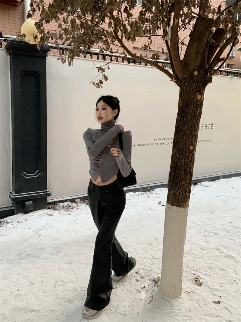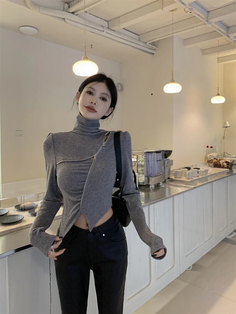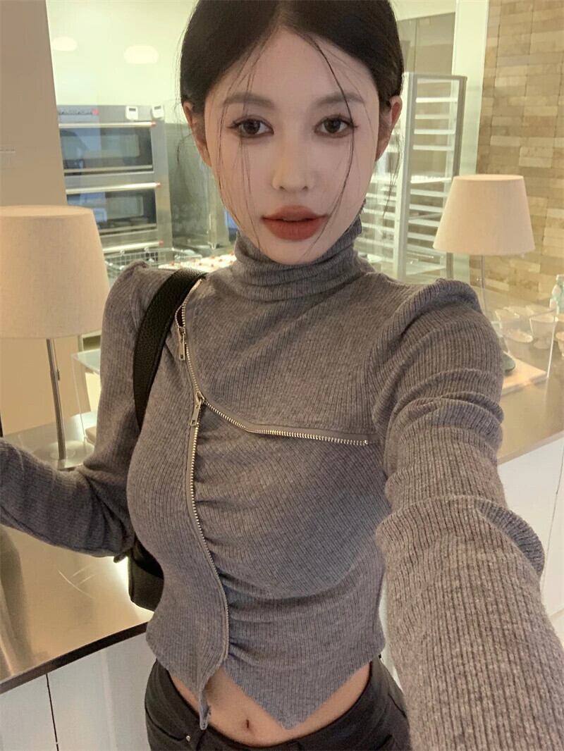 甘いホットガール不規則ジッパーネックセーター冬ボトムスリムフィットニットプルオーバートップ 大人ガーリー スウィート キュート カジュアル ウィンター 冬物