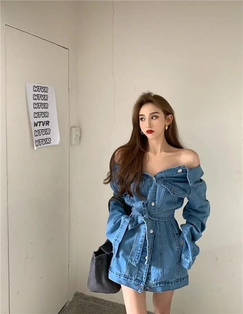 ホットガールレトロオフショルダーショートデニムジャケット秋シングルブレストレースアップスリムフィットカーディガントップ オータム 秋物