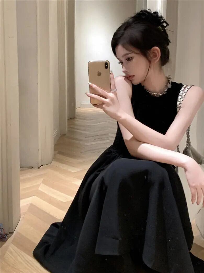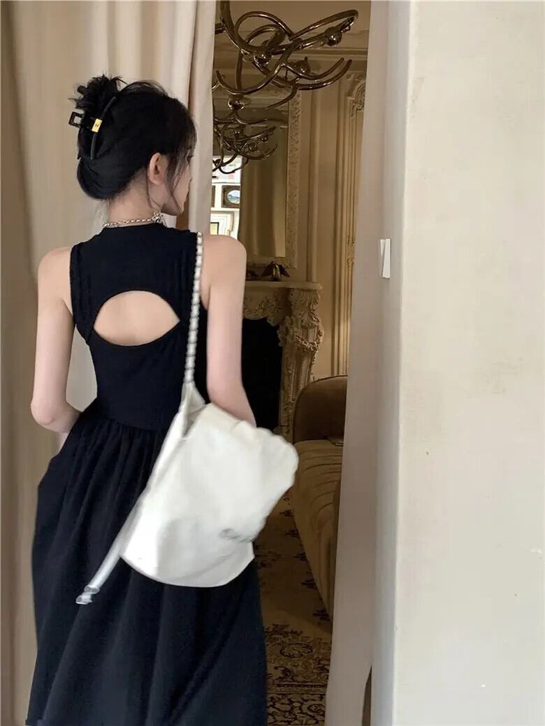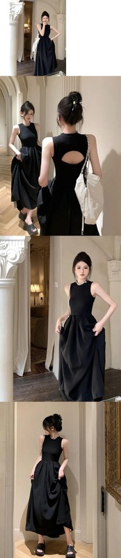 フレンチスウィートホットガールブラックOネックノースリーブ妖精ドレス春アウトオープンバックロングドレス 大人ガーリー キュート カジュアル スプリング 春物