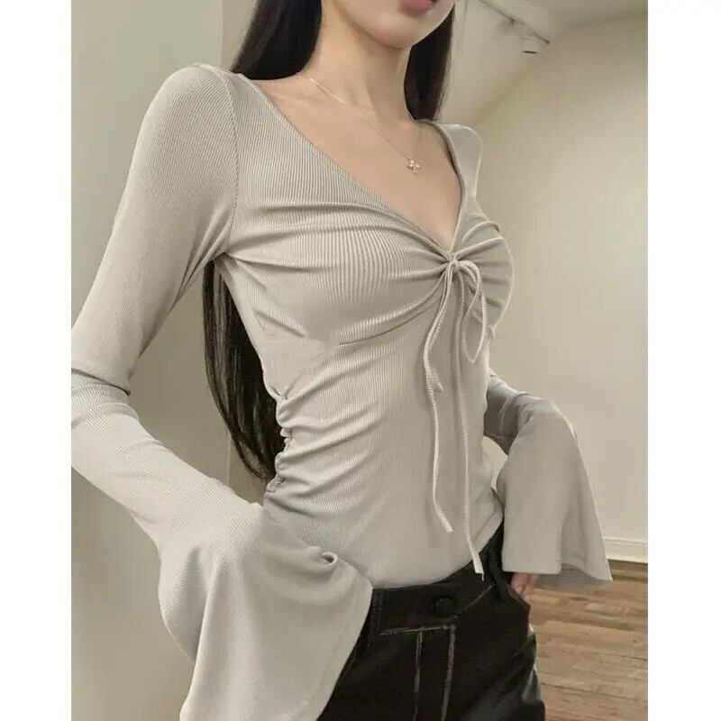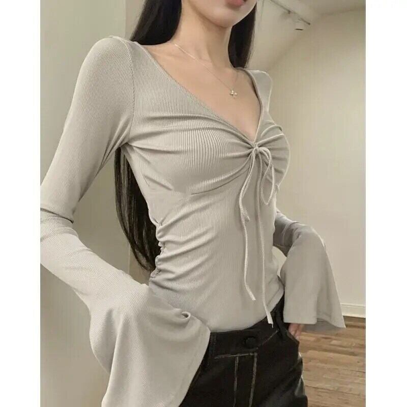 メイラードスタイルホットガール V ネック長袖ショルダー Tシャツ秋スリムフィットレースアップボトムトップ ロング オータム 秋物 Vネック