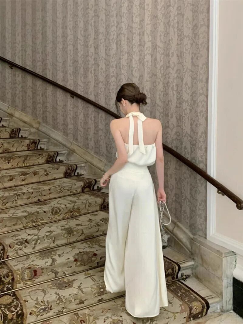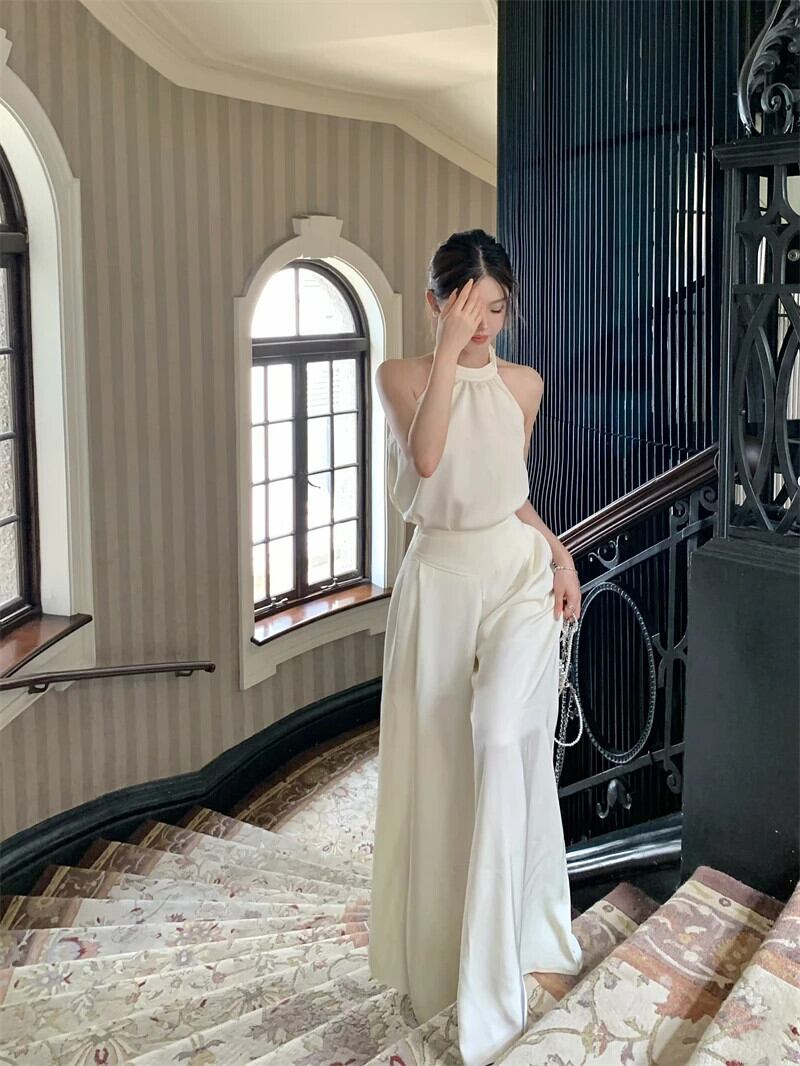 フレンチスイートホットガールスーツ レディース 春 リボン レースアップ ホルターネック タンクトップ ウエスト ワイドレッグ パンツ 2点セット 大人ガーリー スウィート キュート カジュアル スプリング 春物 ワイドパンツ