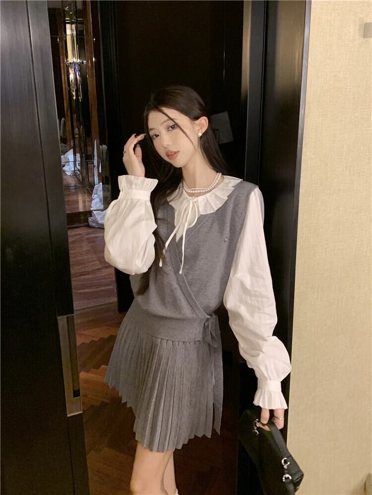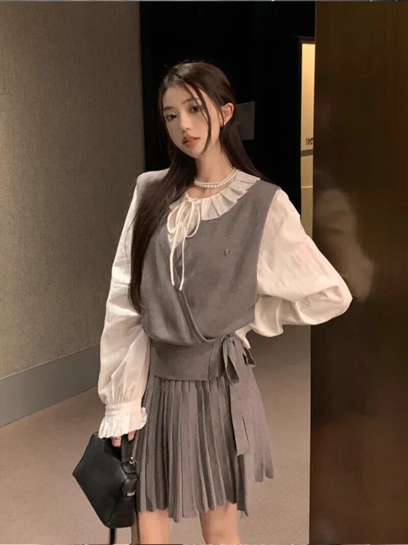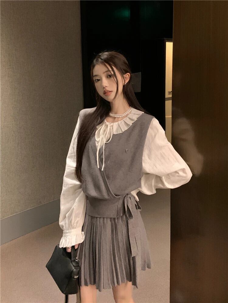 甘いホットガールプレッピースタイルスーツ春スタンドカラーシャツウエストプリーツショートスカートニットベスト 3 点セット 大人ガーリー スウィート キュート カジュアル スプリング 春物
