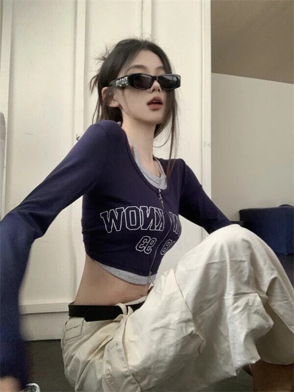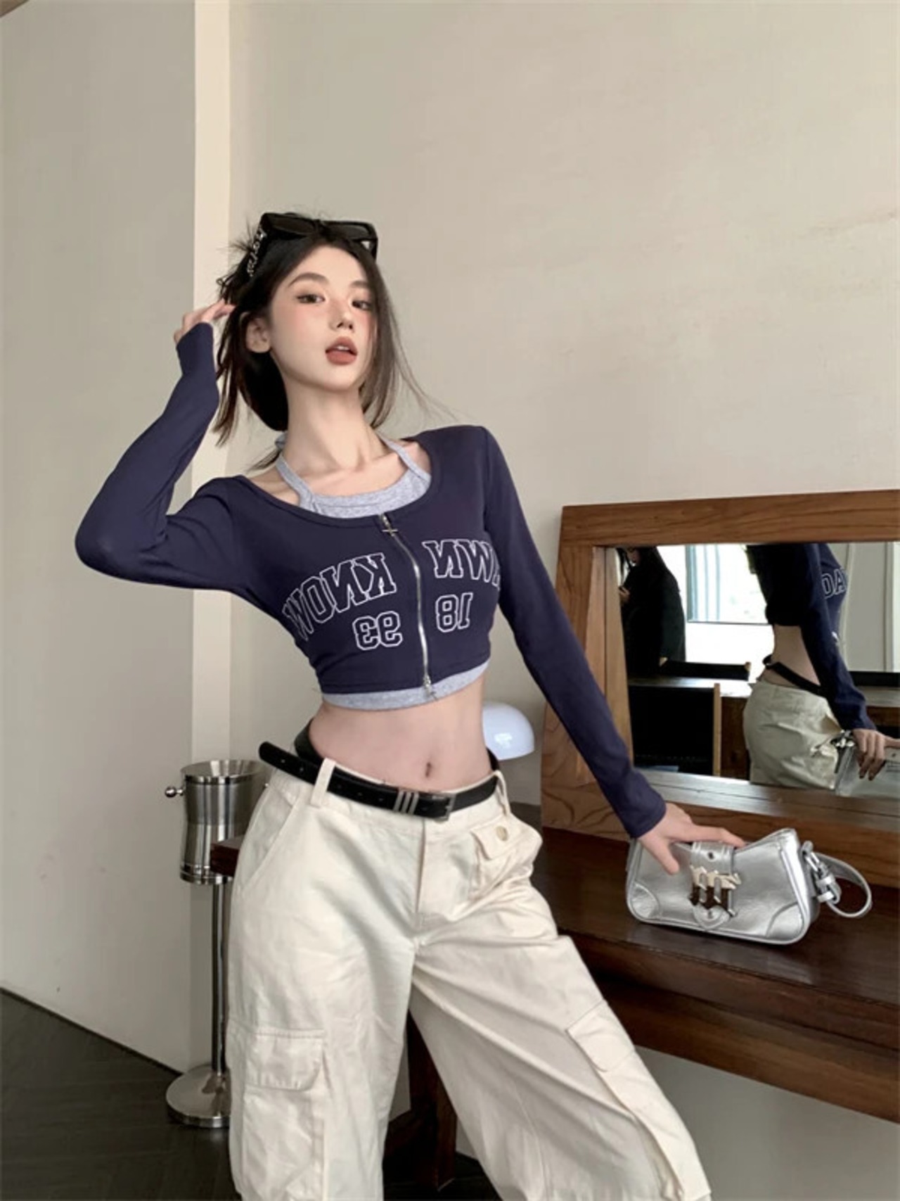 偽ツーピースレタープリントホルターネック長袖 Tシャツ春ホットガールスタイルスリムフィットショートトップ ロング スプリング 春物