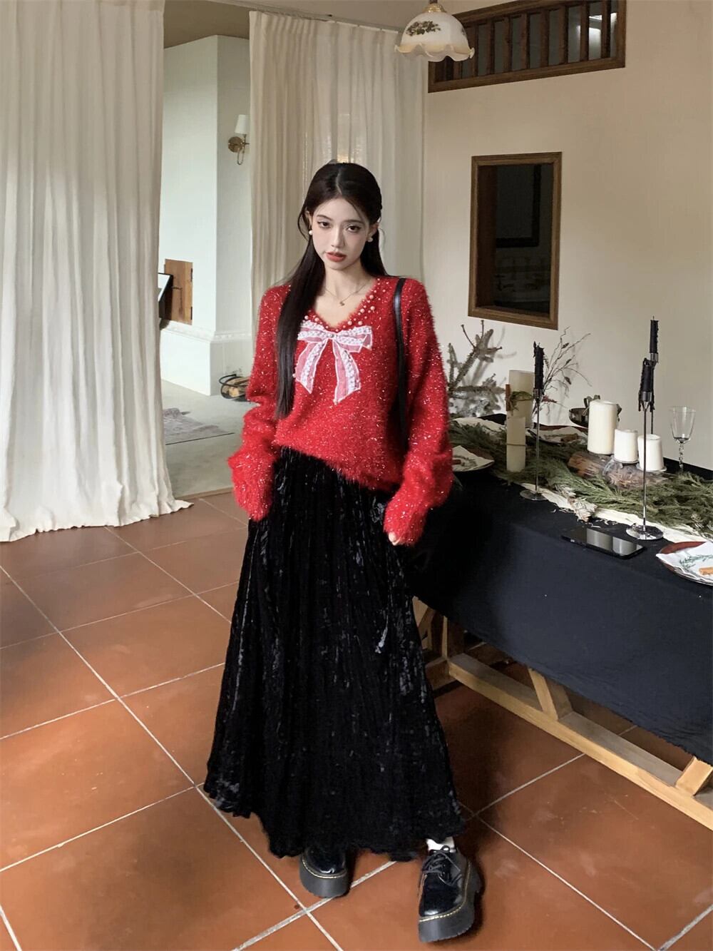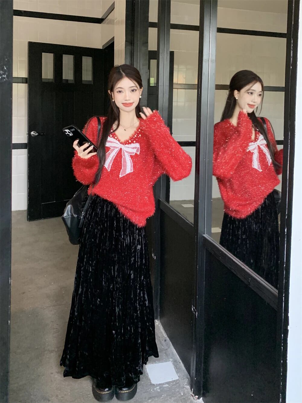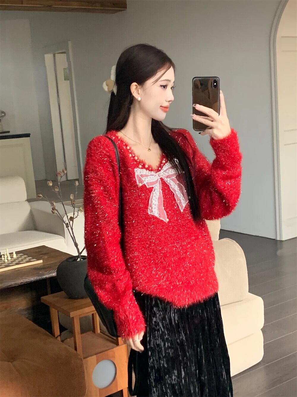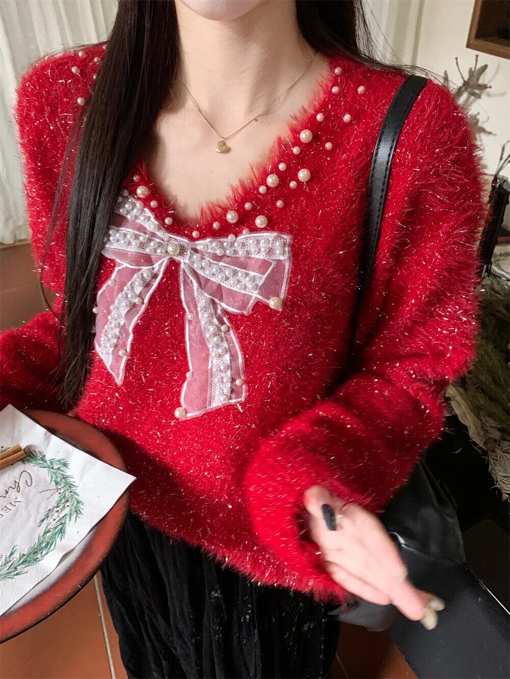 甘いホットガールリボンビーズ V ネック長袖セーター冬赤ルーズニットプルオーバートップ n ロング レッド 大人ガーリー スウィート キュート カジュアル ウィンター 冬物 Vネック