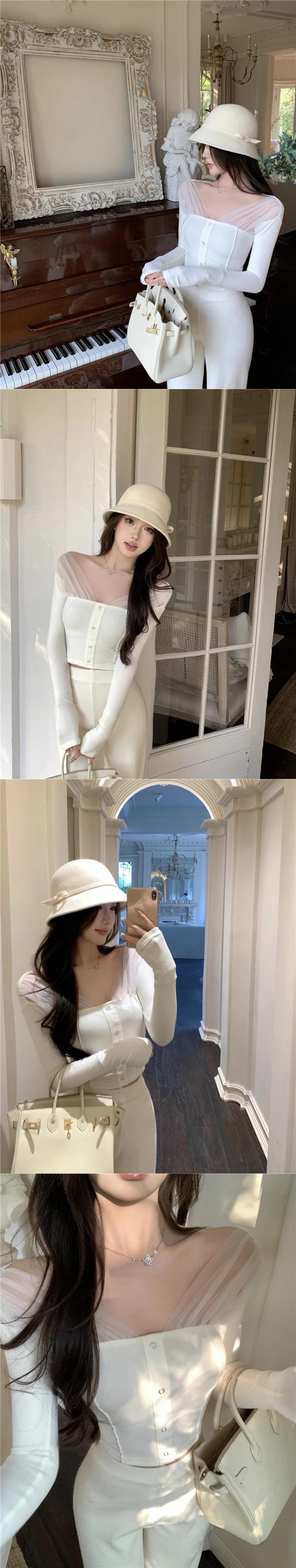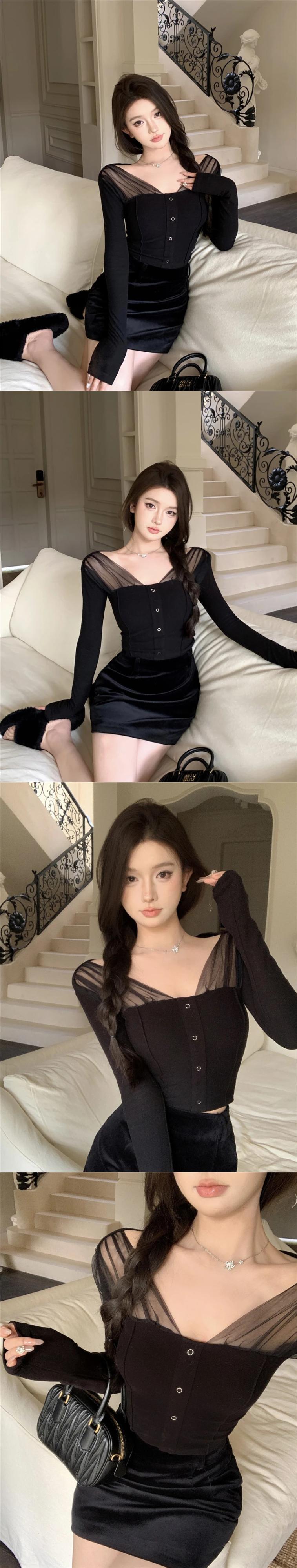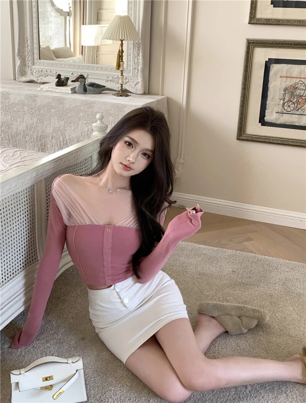 甘い女子セクシー偽ツーピースメッシュスリムフィット Tシャツ春/夏ショートボトム長袖トップ ロング 大人ガーリー スウィート キュート カジュアル スプリング 春物 サマー 夏物