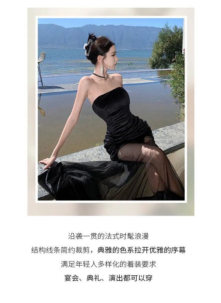 フレンチスイートホットガールブラックストラップレスドレス春スリムフィット透明Aラインメッシュロングドレス 大人ガーリー スウィート キュート カジュアル スプリング 春物